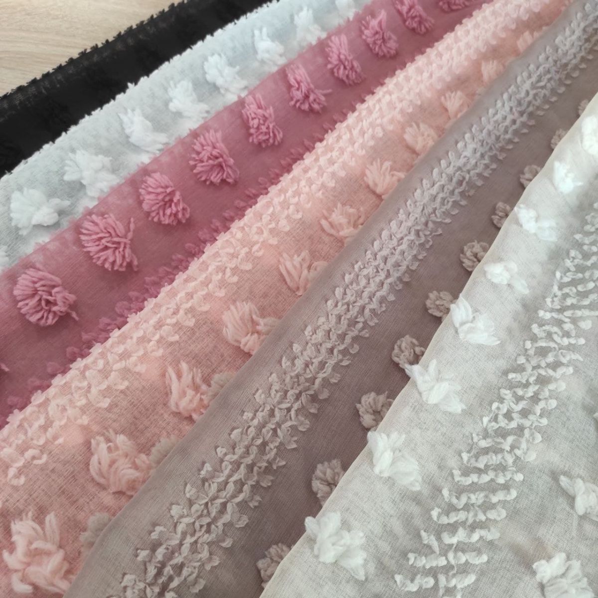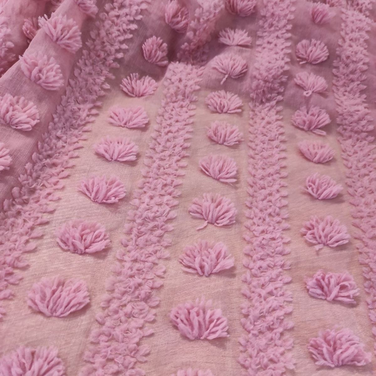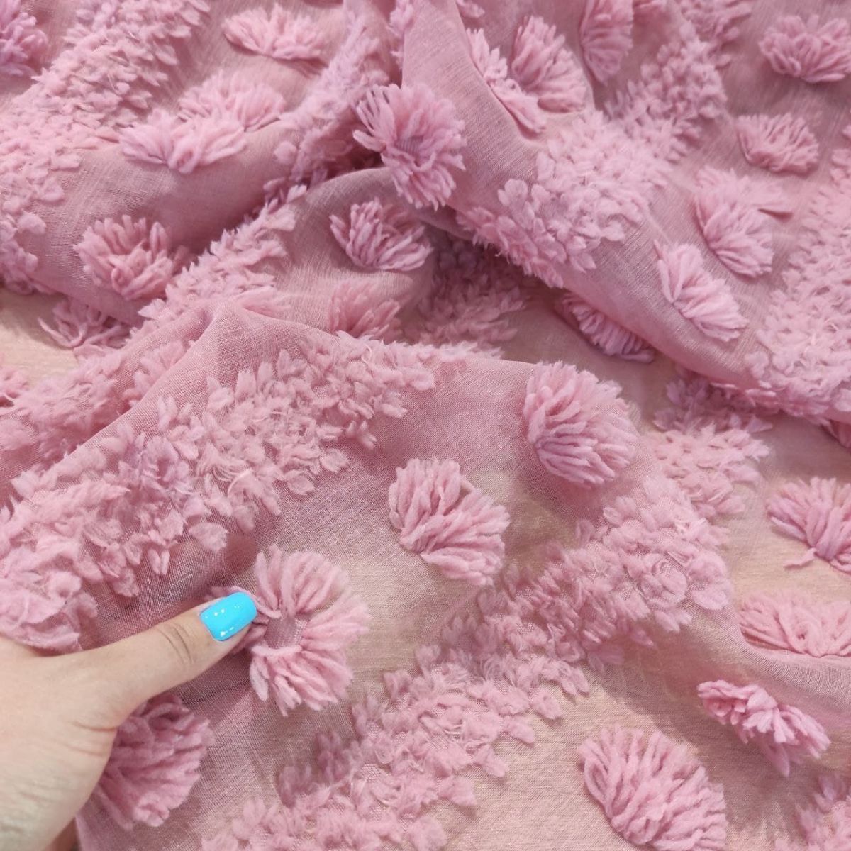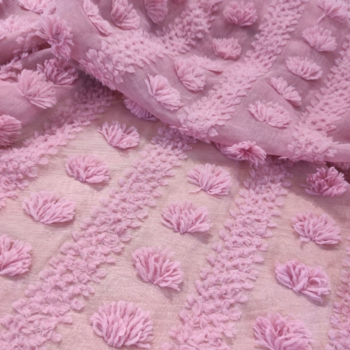 М'яка, матова, напівпрозора тканина з ефектним об'ємним великим декором. Декор розташований полосами вздовж полотна. Тканина не тягнеться, не ковзає, але приємна до тіла, добре тримає форму, гарно пропускає повітря.