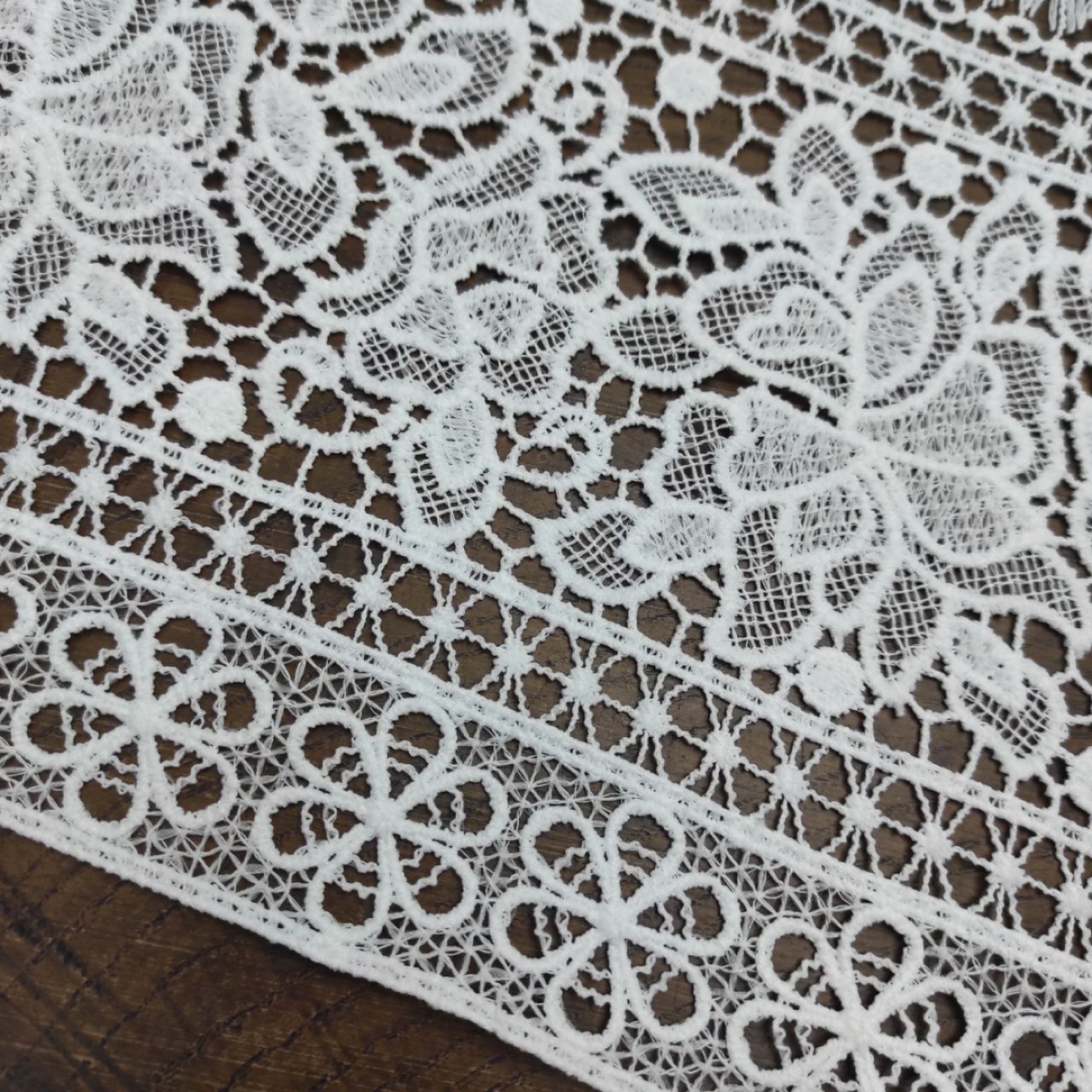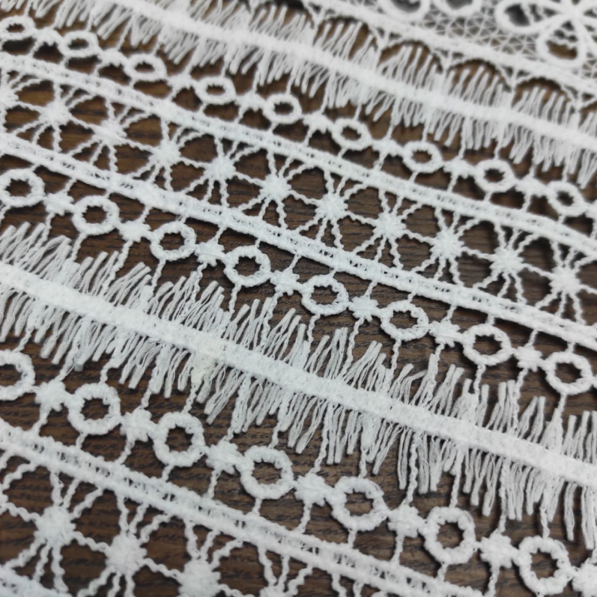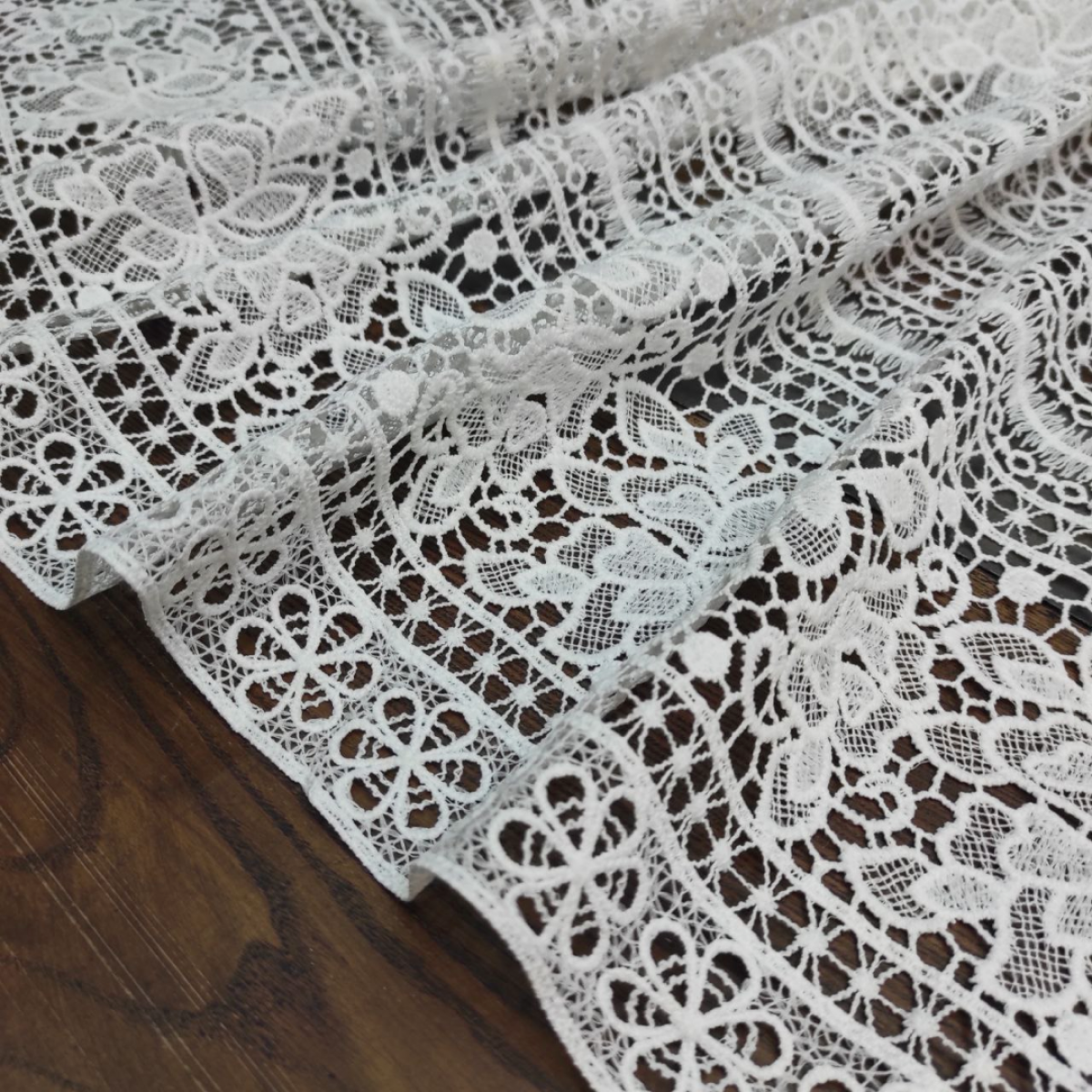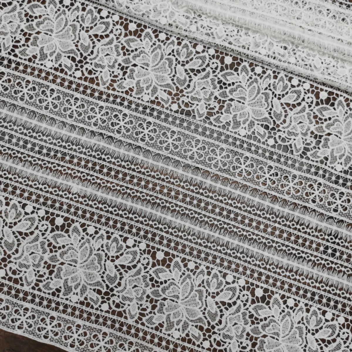 Ніжне мереживо в стилі макраме. Рельєфний орнамент з етнічними мотивами залюбки можна різати на фрагменти шириною від 2,5см. Завдяки змішаному складу тканини мереживо менше мнеться. Прекрасно поєднується з нашим натуральним мереживом макраме. Тканина ідеально підходить для шиття ажурних суконь, веільних суконь та аксесуарів, спідниць, блуз із мереживними вставками, трендових боючних костюмів, тощо.