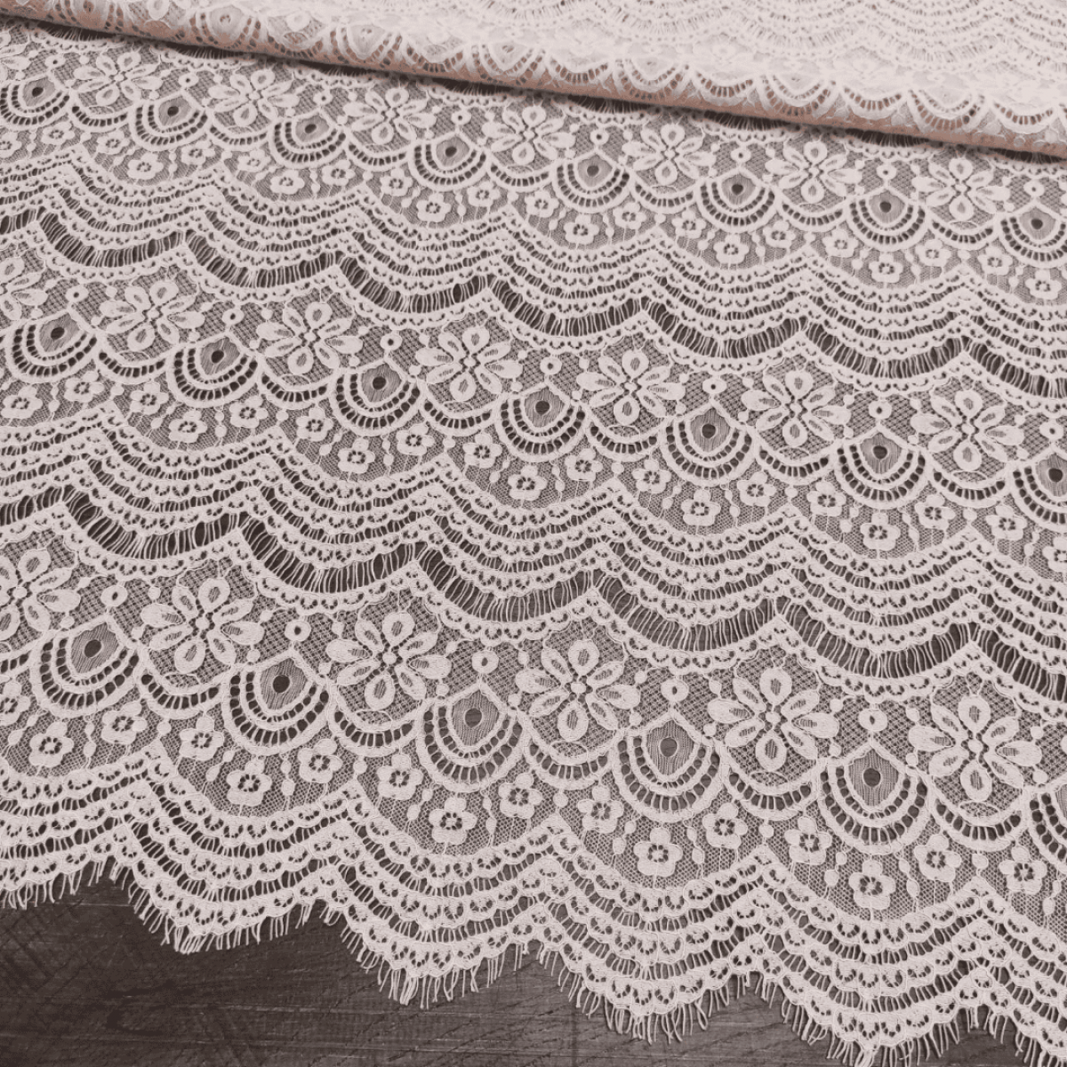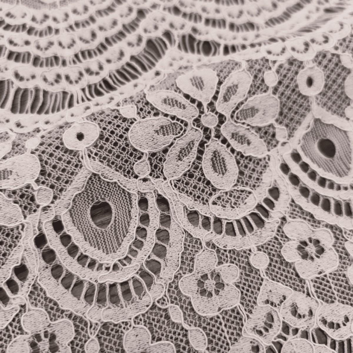 Мереживна тканина "Bloom" з тонкою кордовою ниткою, яка створює фактурний кант по краю кожного фрагмента візерунка по лицьовій стороні. Виворітна сторона гладенька.