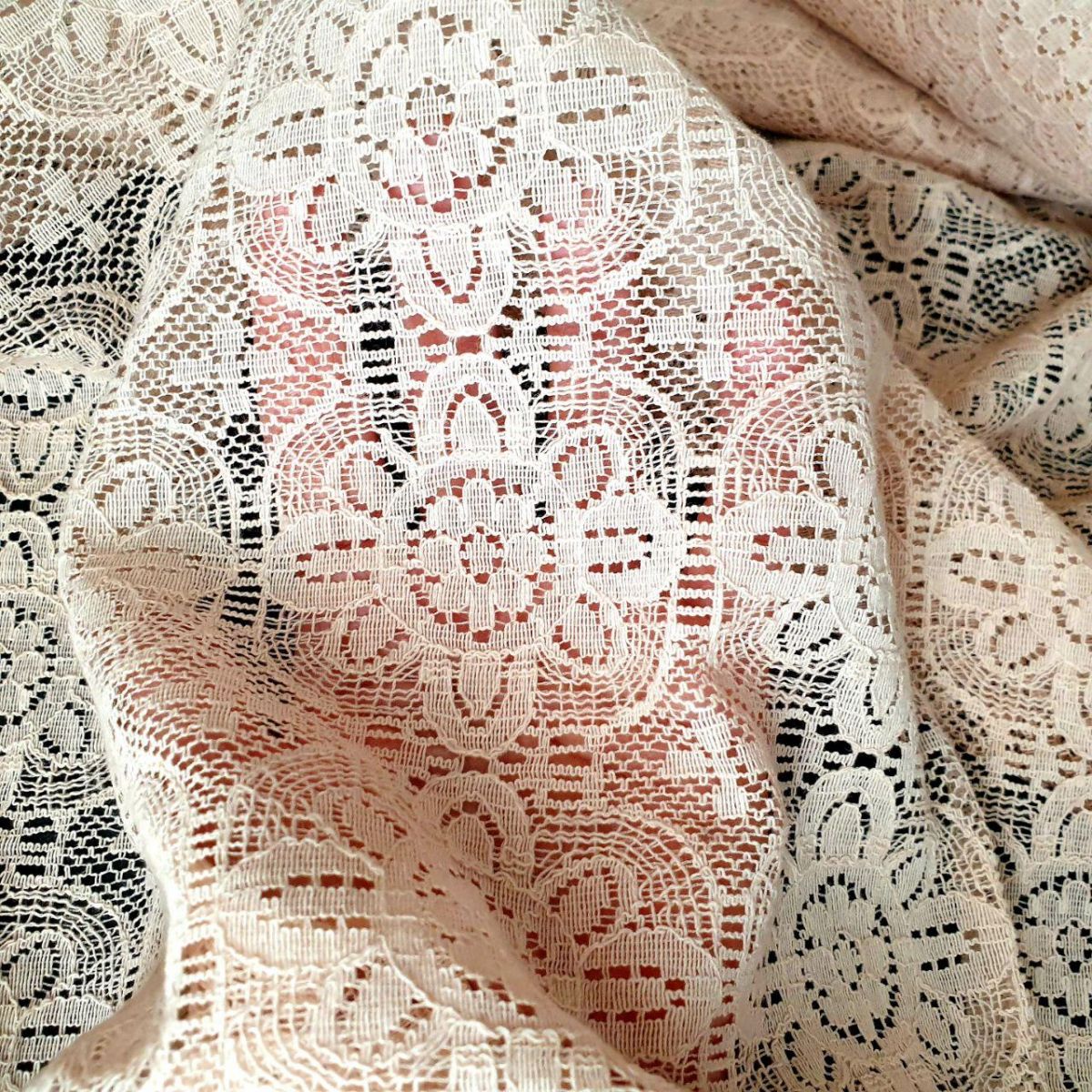 Мереживна тканина "Гібіскус" з натуральною ниткою з геометрично-квітковим малюнком на сітці. Оздоблення більш щільною ниткою по краю візерунку додає малюнку виразності та фактурності. Тканина м'яка і приємна, добре драпірується, підійде для виробів з воланами.