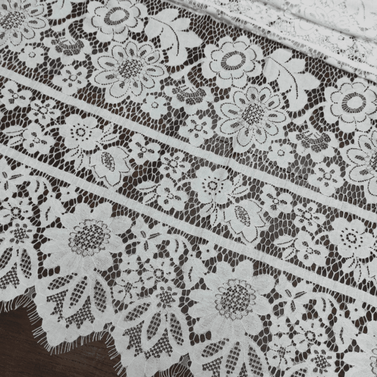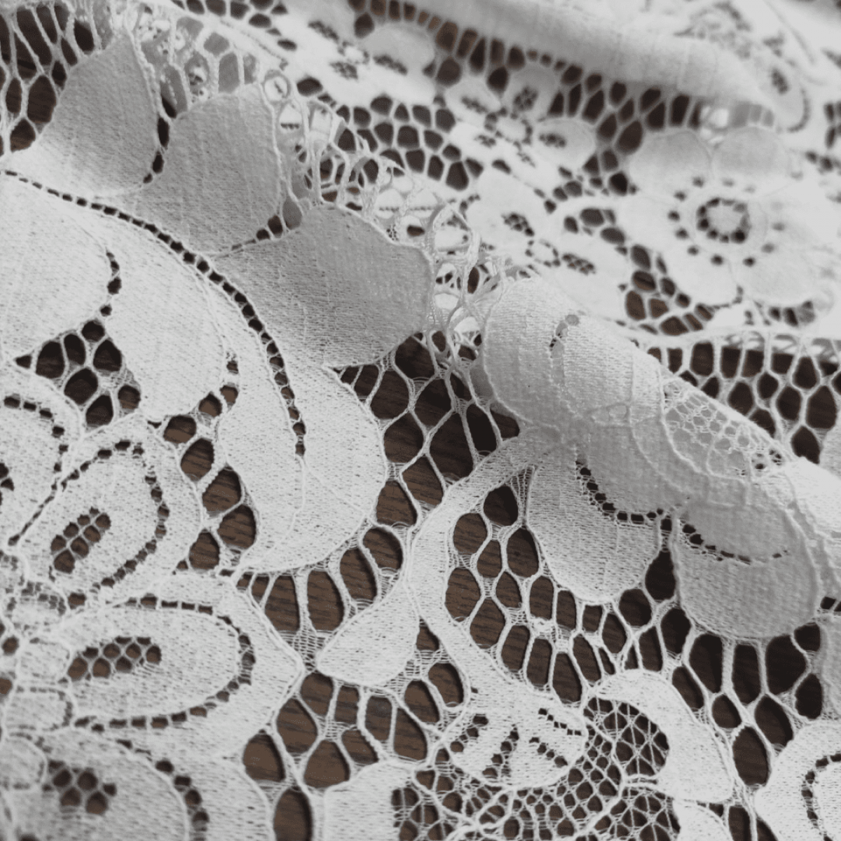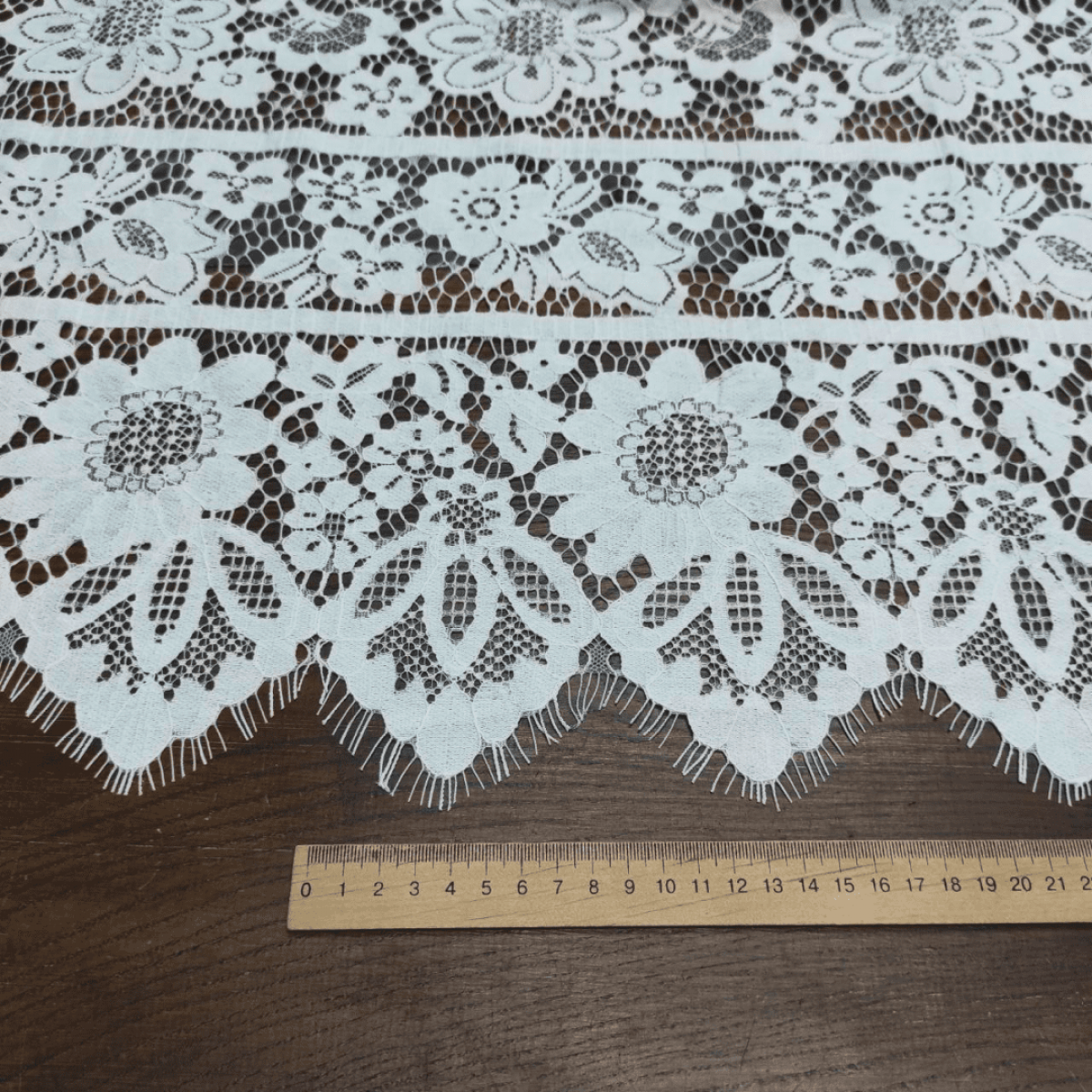 Мереживне полотно "Joli" з натуральною ниткою, купонна тканина в рулонах, відмінна риса якого - рельєфний контур по краю малюнка на великій сітці. Тканина м'яка, матова, не тягнеться, виворітна сторона гладка.