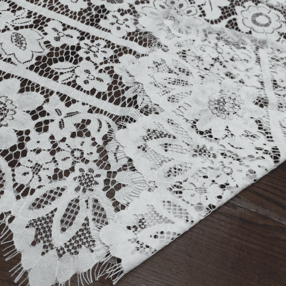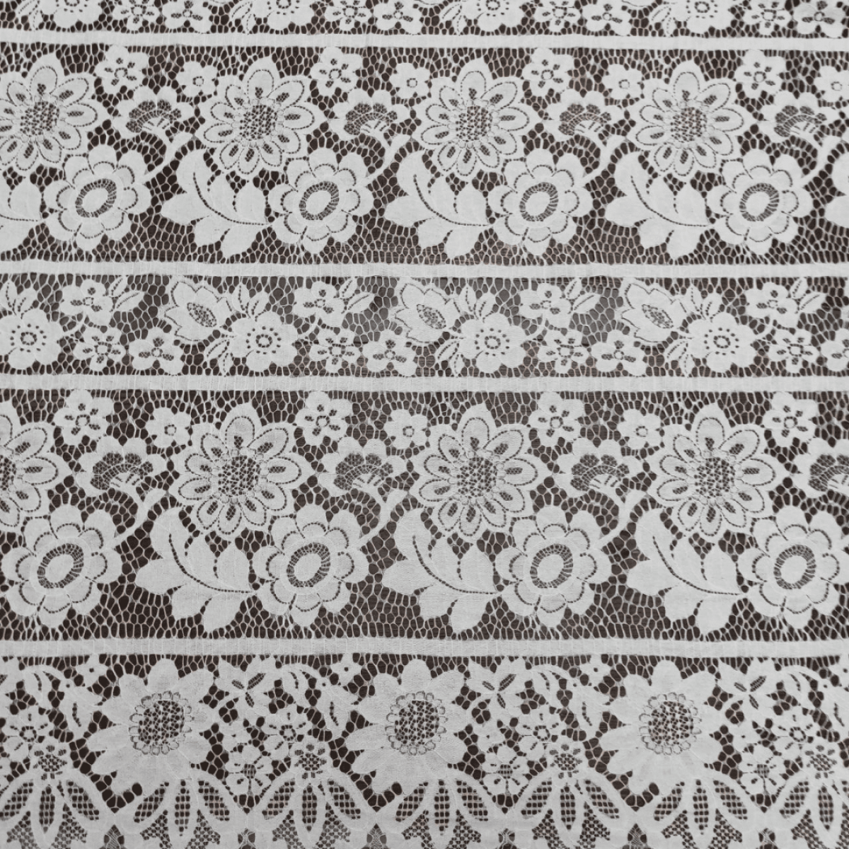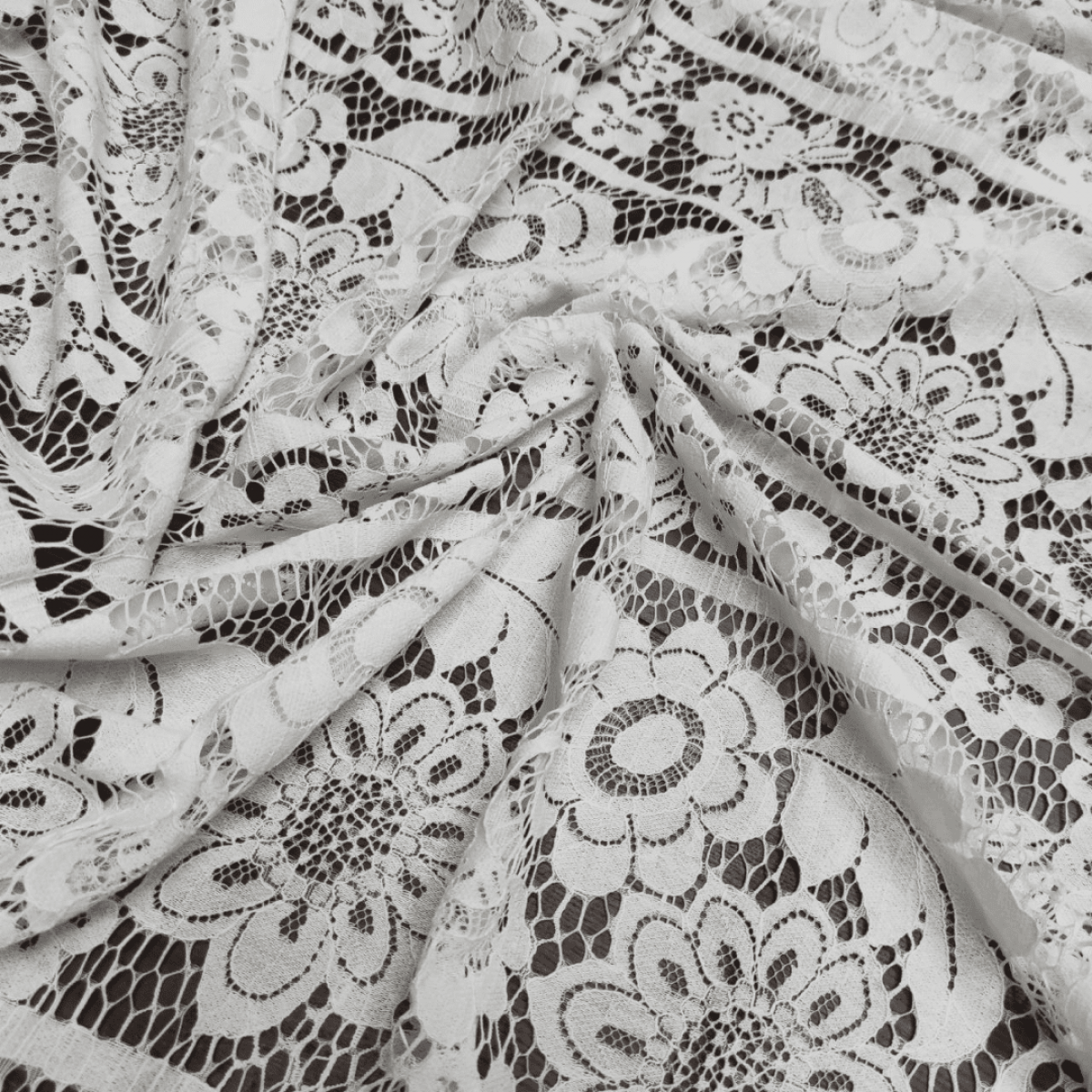 Мереживне полотно "Joli" з натуральною ниткою, купонна тканина в рулонах, відмінна риса якого - рельєфний контур по краю малюнка на великій сітці. Тканина м'яка, матова, не тягнеться, виворітна сторона гладка.