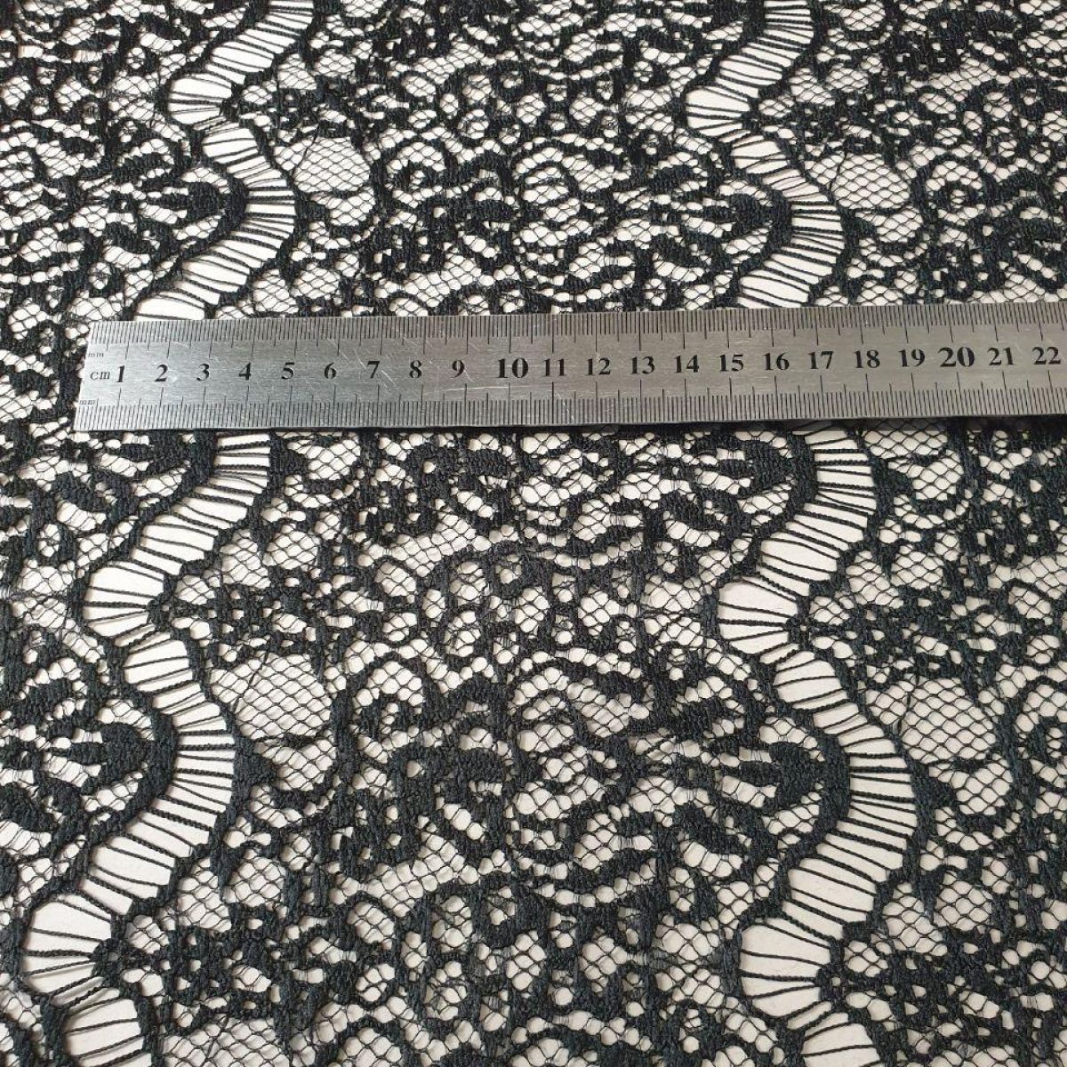 Щільна мереживна тканина "Каскад" чорного кольору з квітковим малюнком на сітці, розташованим смугами шириною 13см і розділеними віями, завдяки чому легко ділиться на фрагменти з красивим закінченим краєм. Оздоблення кордовою ниткою додає малюнку виразності та фактурності.