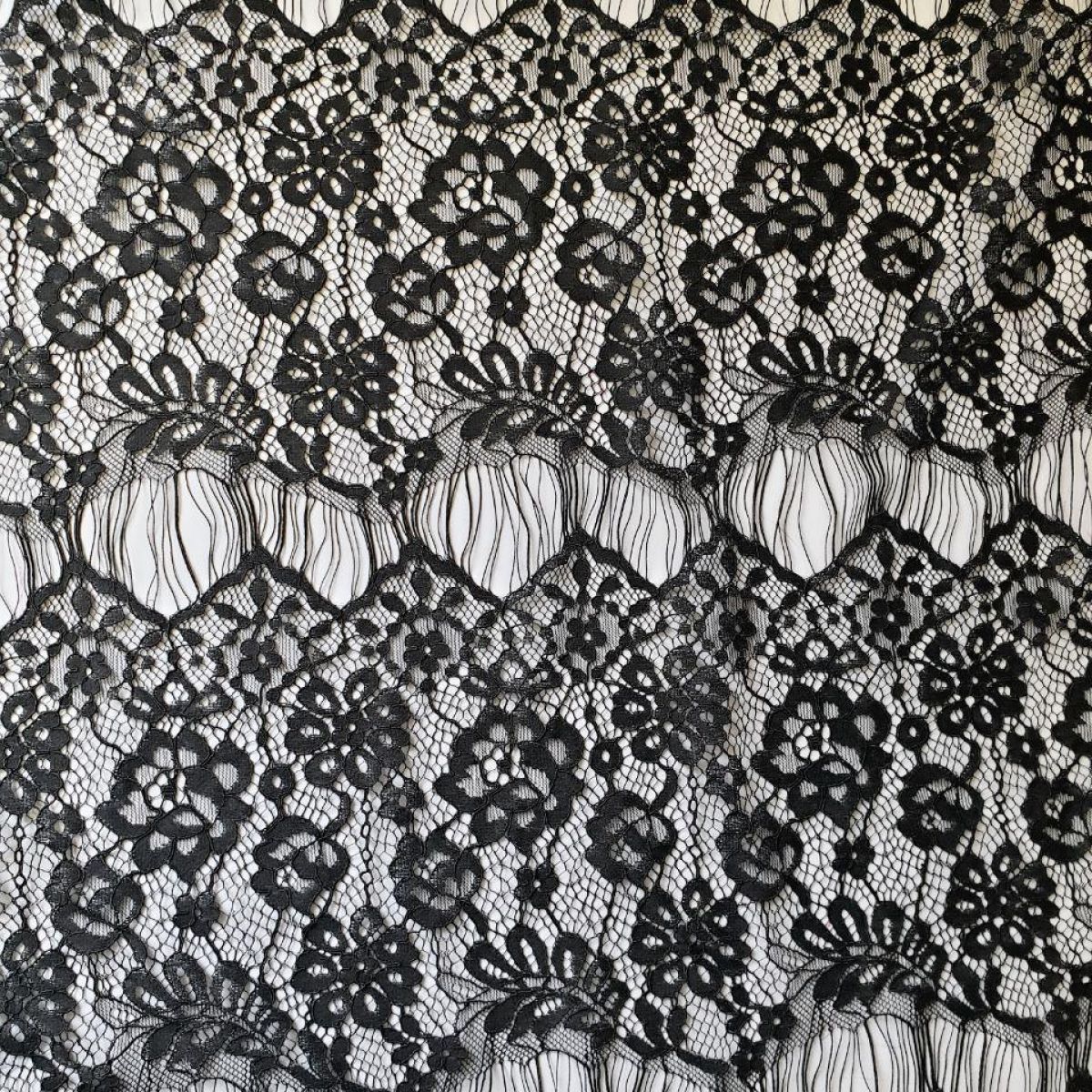 Мереживна фактурна тканина з кордовою ниткою "Spring" з квітковим малюнком на сітці, розташованим смугами шириною 18см і розділеними віями, завдяки чому легко ділиться на фрагменти з красивим закінченим краєм. Оздоблення кордовою ниткою додає малюнку виразності та фактурності.