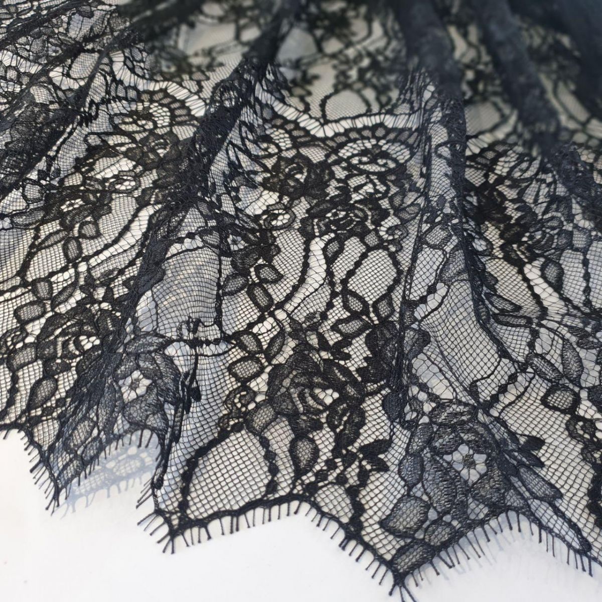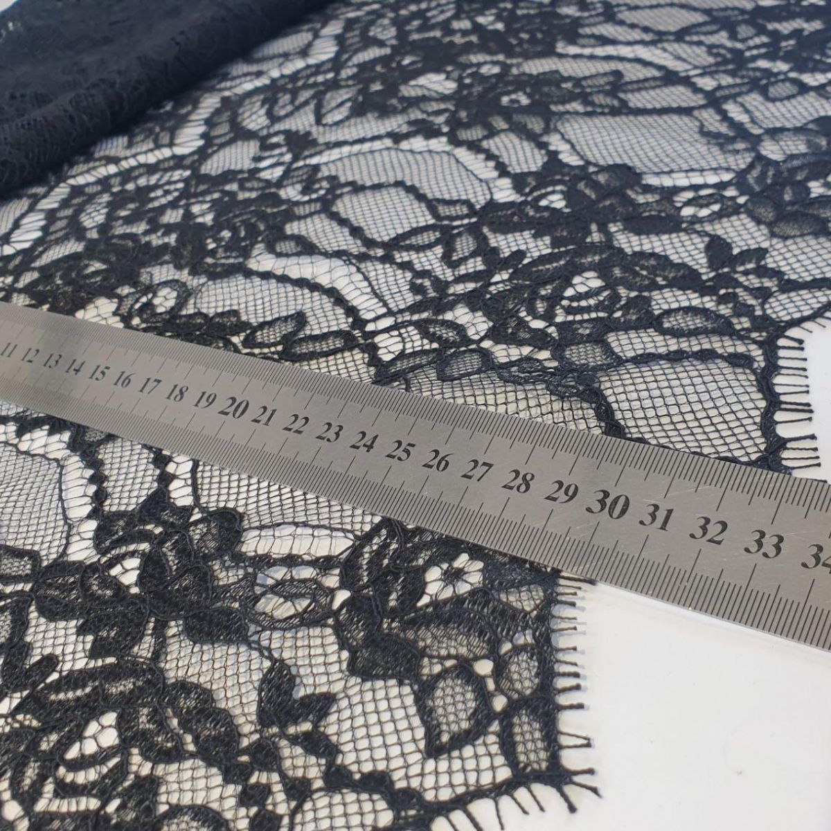 Мереживне полотно "Stella" з кордовою ниткою можна розрізати на фрагменти, які можна використовувати як окремі смуги мережива довжиною 1,5 метра та шириною 28 см з фігурним краєм з віями. Тканина в міру щільна, добре тримає форму, обробка кордовою ниткою по лицьовому боці додає малюнку виразності та фактурності. Виворітна сторона гладка. Тканина не тягнеться, але злегка грає завдяки сітці основі.
