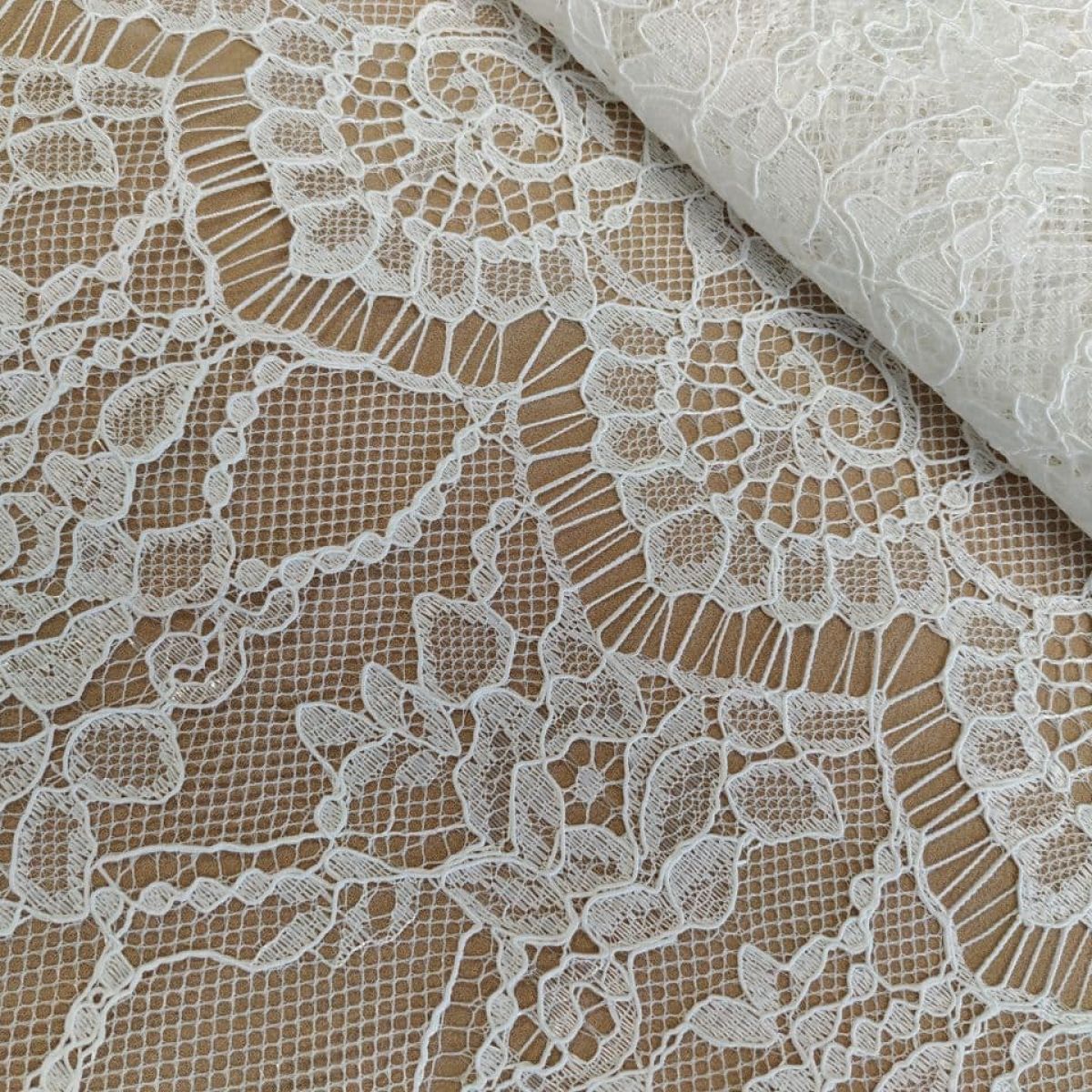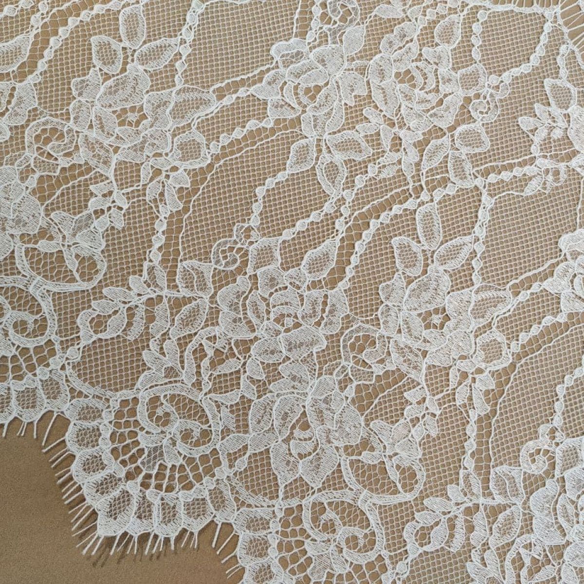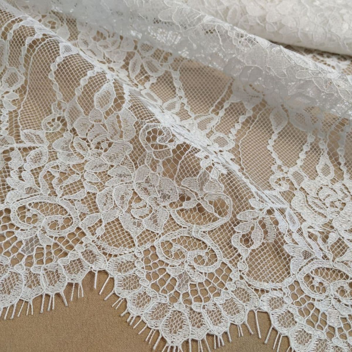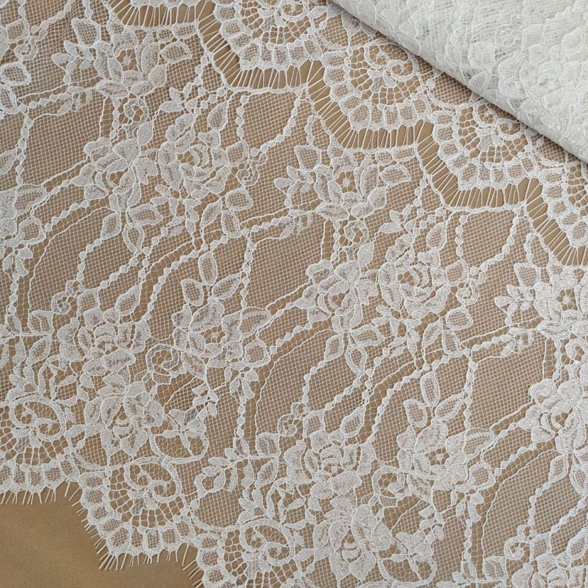 Мереживне полотно "Stella" з кордовою ниткою можна розрізати на фрагменти, які можна використовувати як окремі смуги мережива довжиною 1,5 метра та шириною 28 см з фігурним краєм з віями. Тканина в міру щільна, добре тримає форму, обробка кордовою ниткою по лицьовому боці додає малюнку виразності та фактурності. Виворітна сторона гладка. Тканина не тягнеться, але злегка грає завдяки сітці основі.