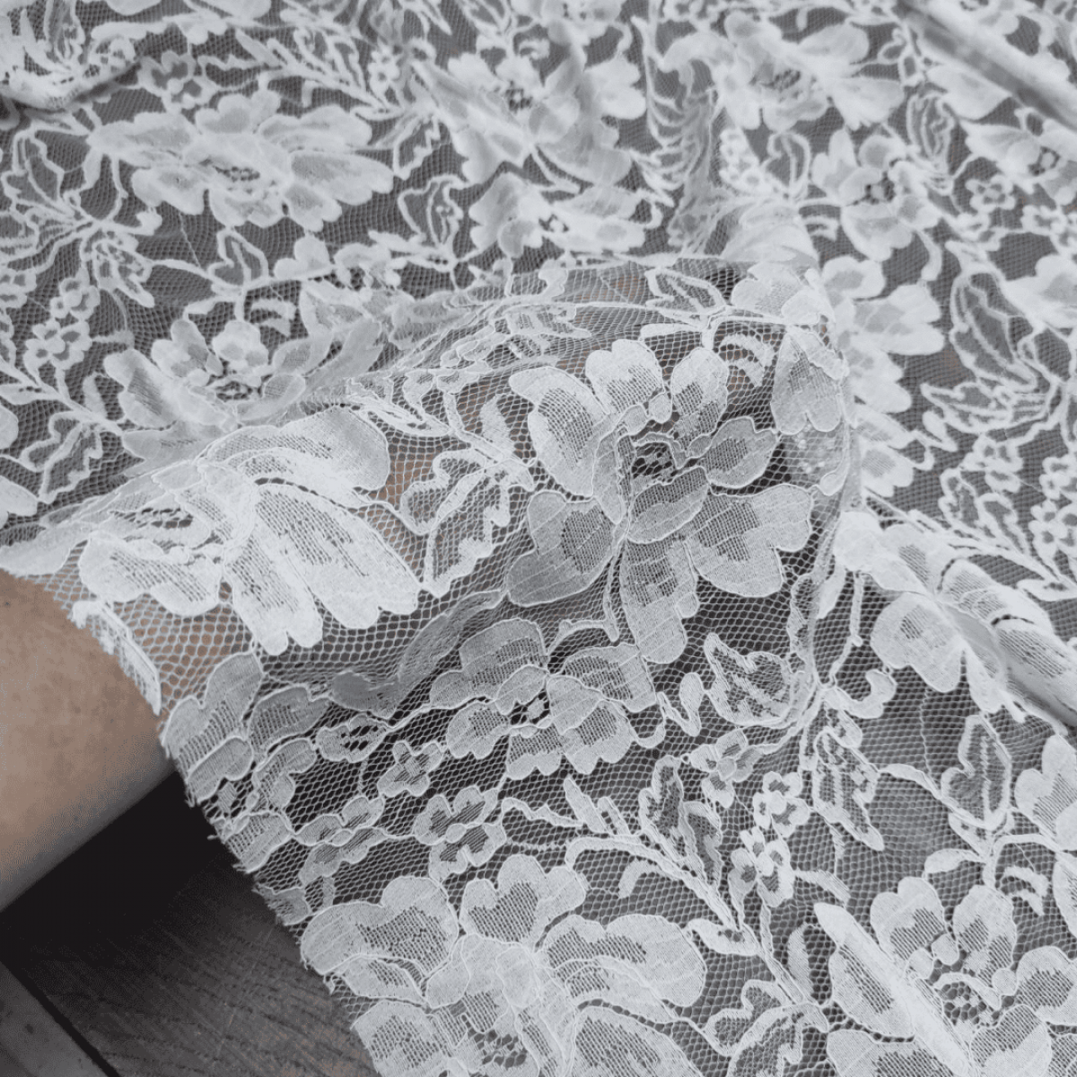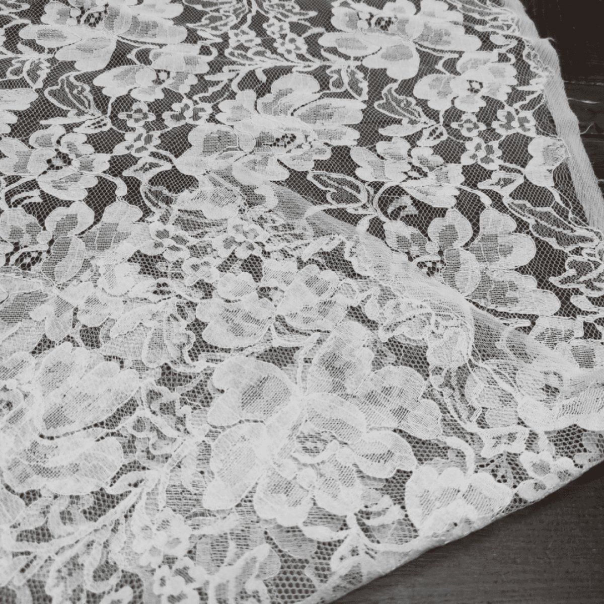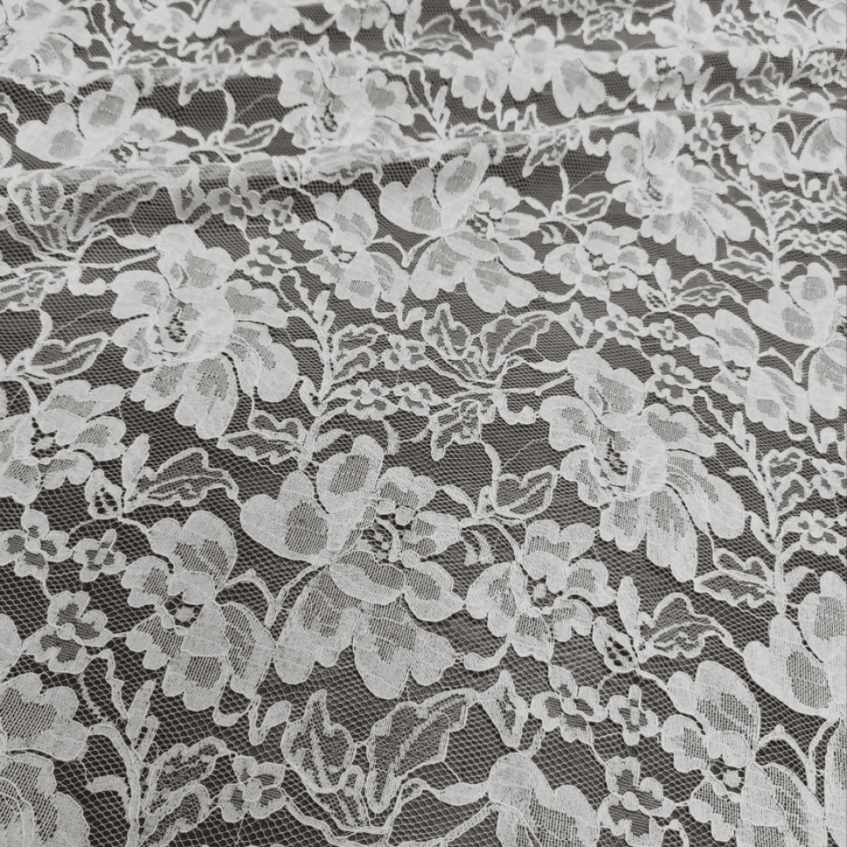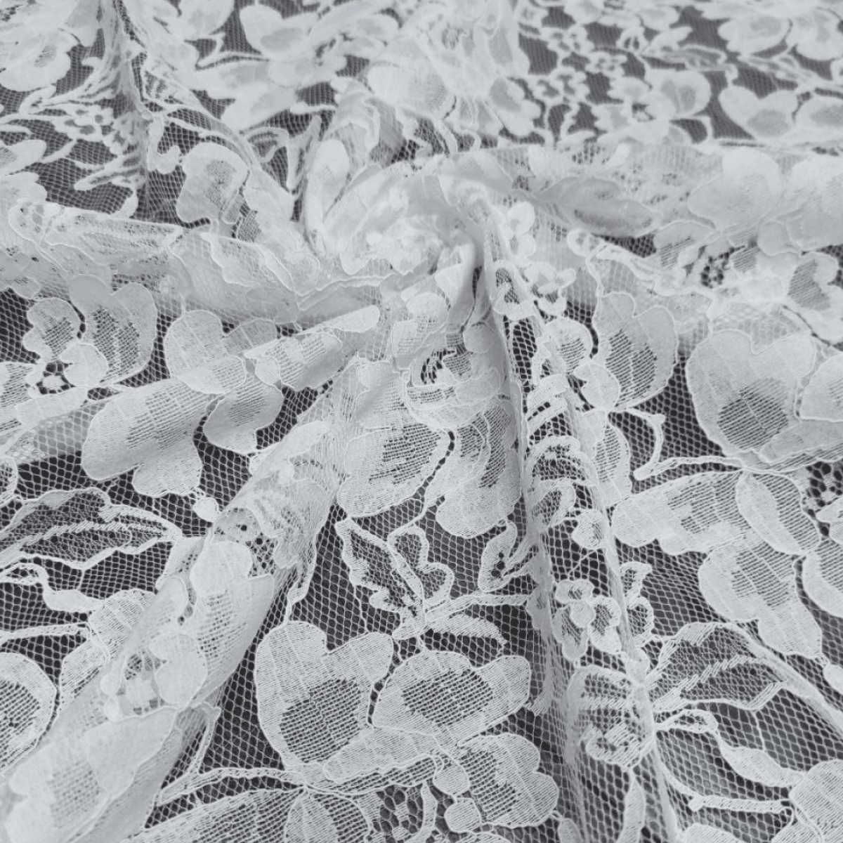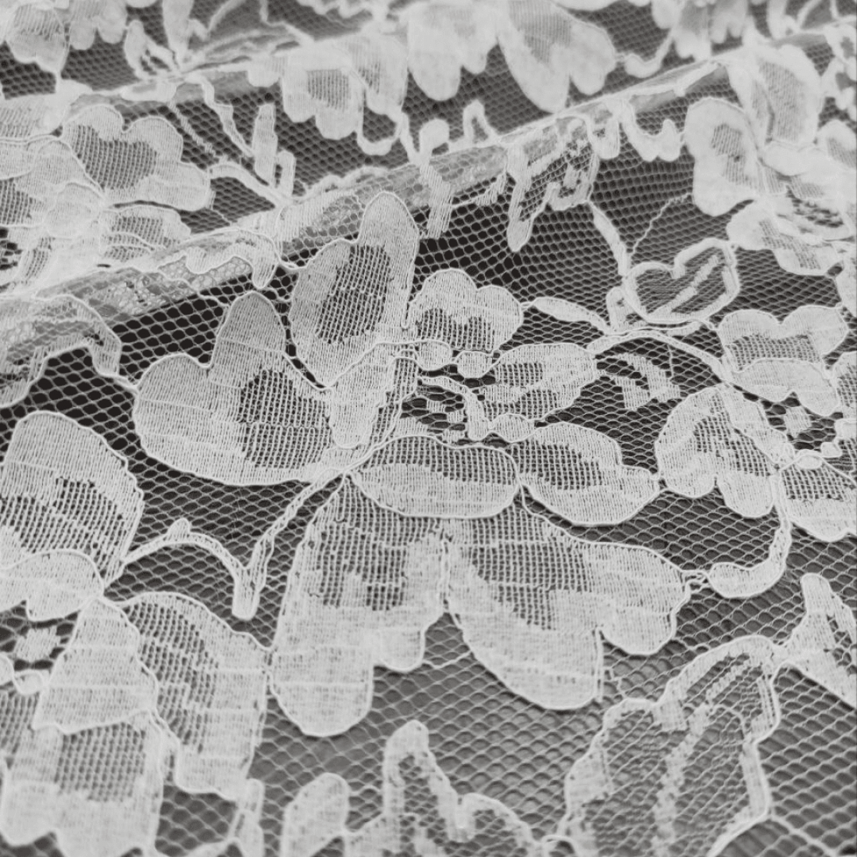 Мереживне полотно "Vivien" з кордовою ниткою, відмінна риса якого - рельєфний контур, обшитий по краю малюнка більш товстою ниточкою. Тканина матова, не тягнеться, добре тримає форму, але не жорстка, грає за рахунок крупної сітки основи, виворітна сторона гладка, шовковиста, приємна. Ця тканина дивовижно виглядає у весільних сукнях та аксесуарах і не тільки. Сучасна мода використовує мереживні тканини і у повсякденних образах, комбінуючи мереживо з різними тканинами, навіть з джинсовою. Використовується як у цільному виробі, так і для окремих елементів, вставок.
