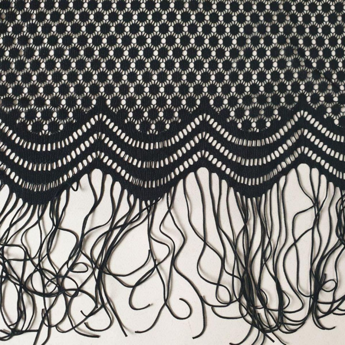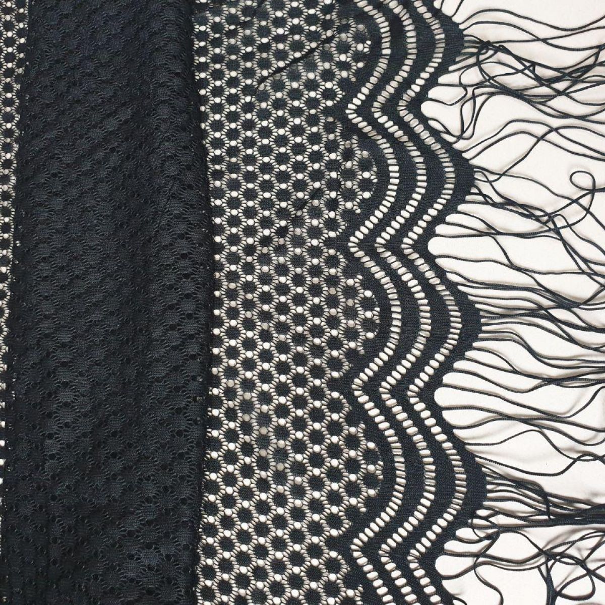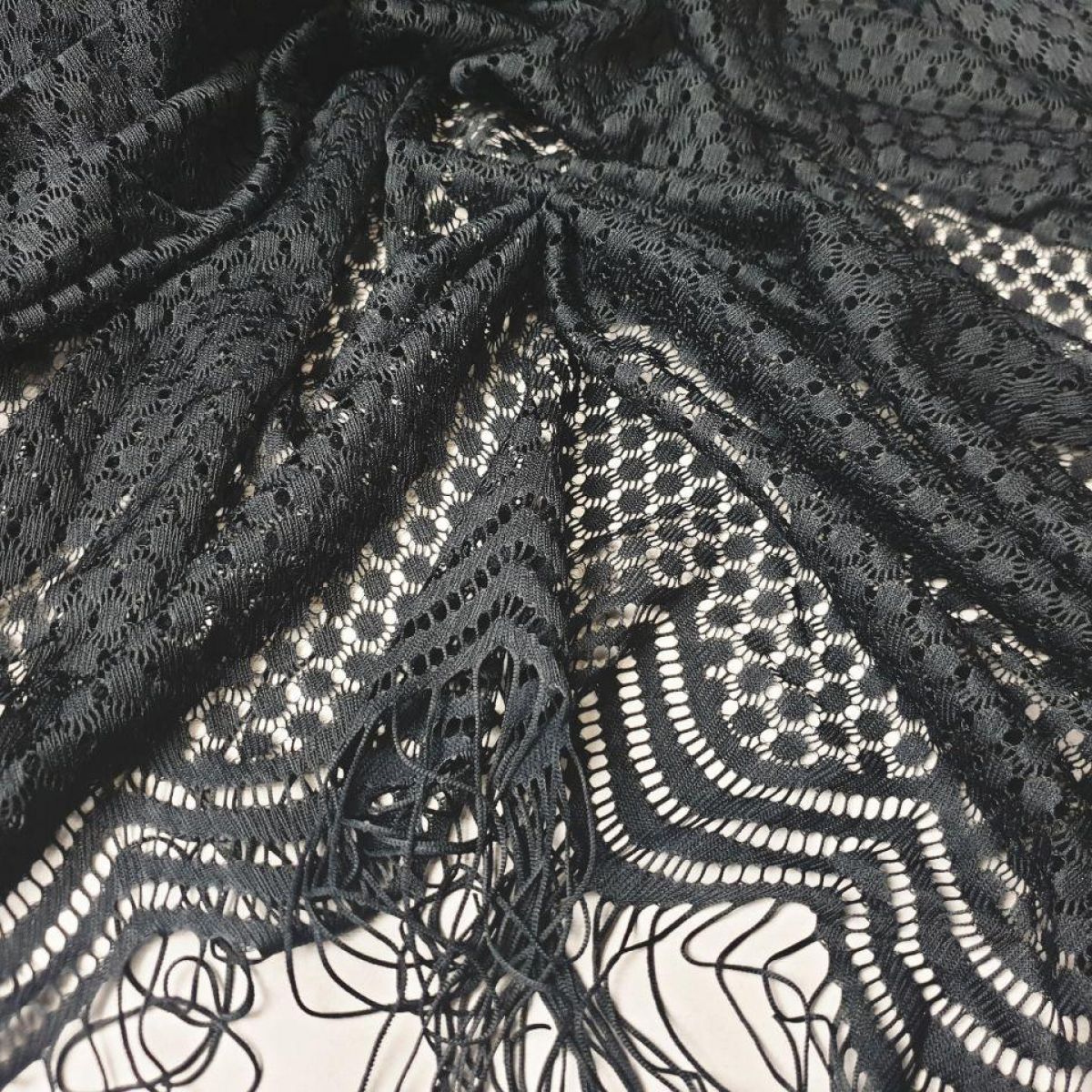 Дуже еластичне, якісне тонке плетіння із закінченим ажурним краєм з бахромою з двох сторін. Продається купонами 3*1,5 метри.