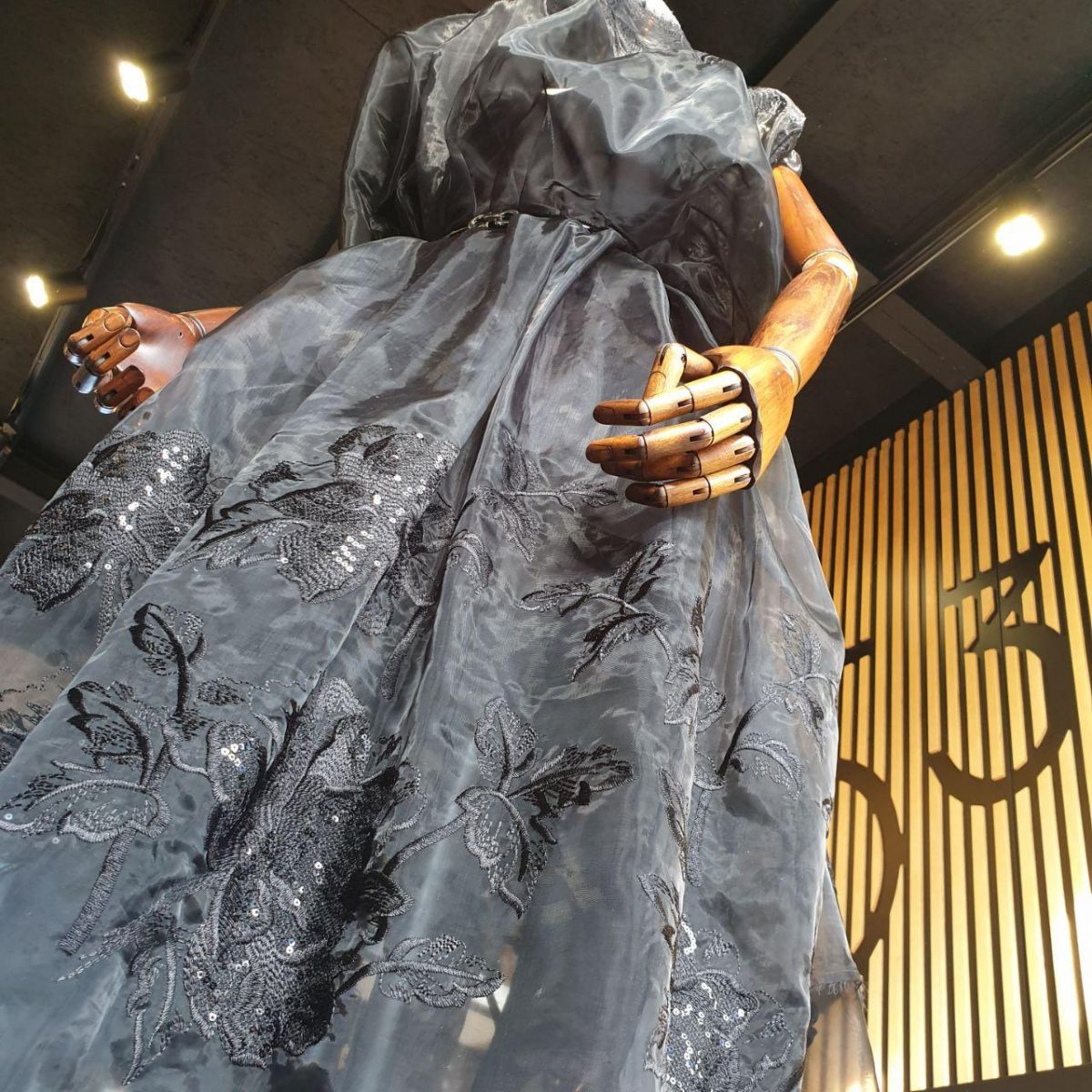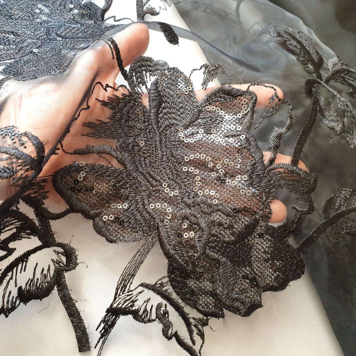 Органза з вишитими шовковою ниткою квітами і з паєтками виглядає неймовірно святково. Малюнок дублюється дзеркально з двох сторін. Висота малюнка – 40 см. Полотно щільне, добре тримає форму. Підходить для вечірнього вбрання.