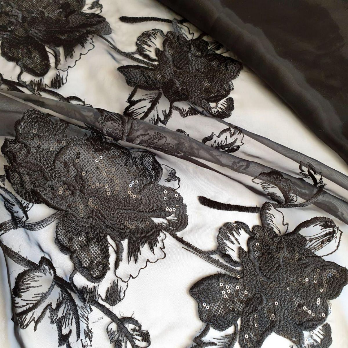 Органза "Півонія" з вишивкою та паєтками 01 Чорний