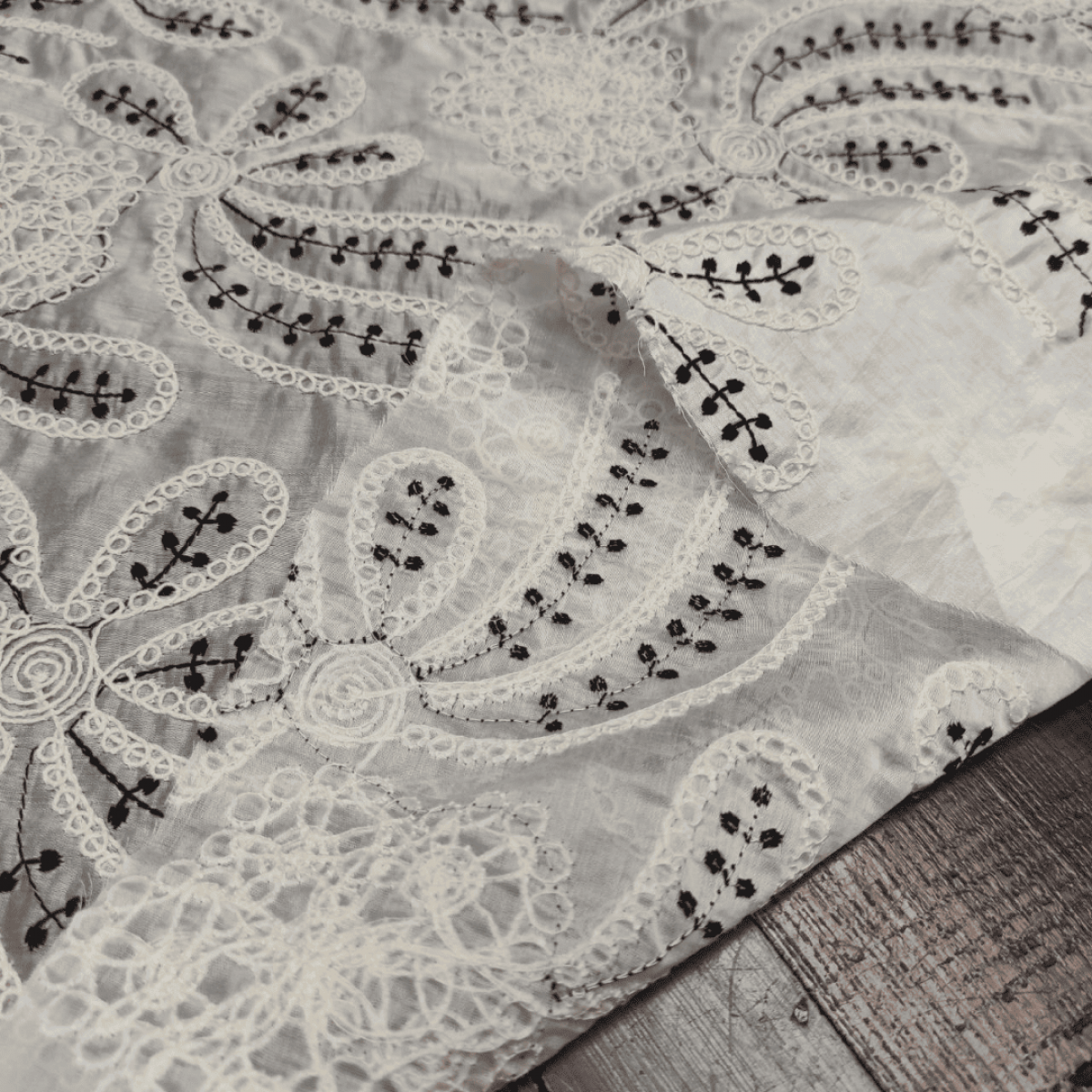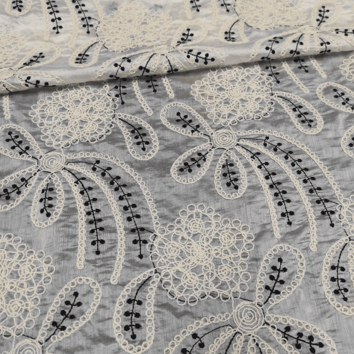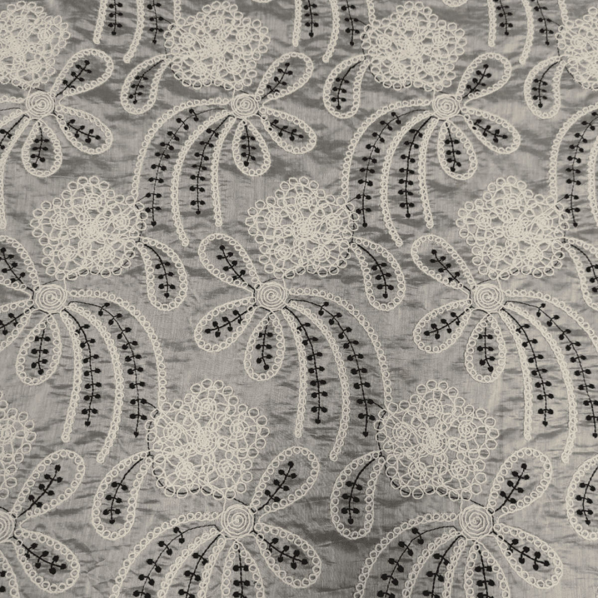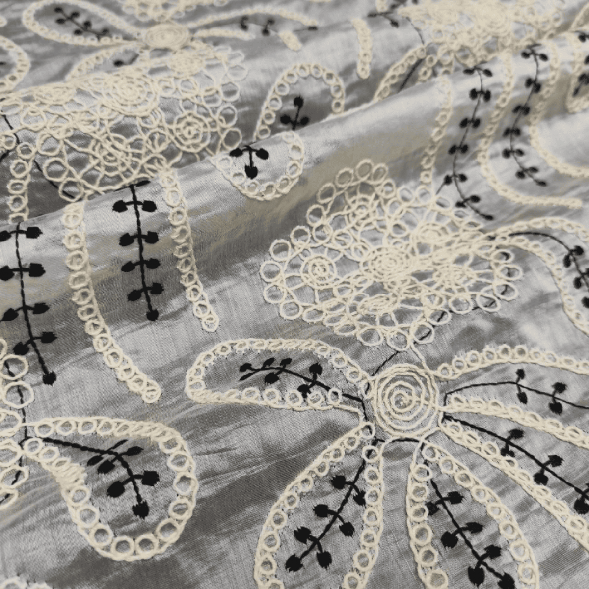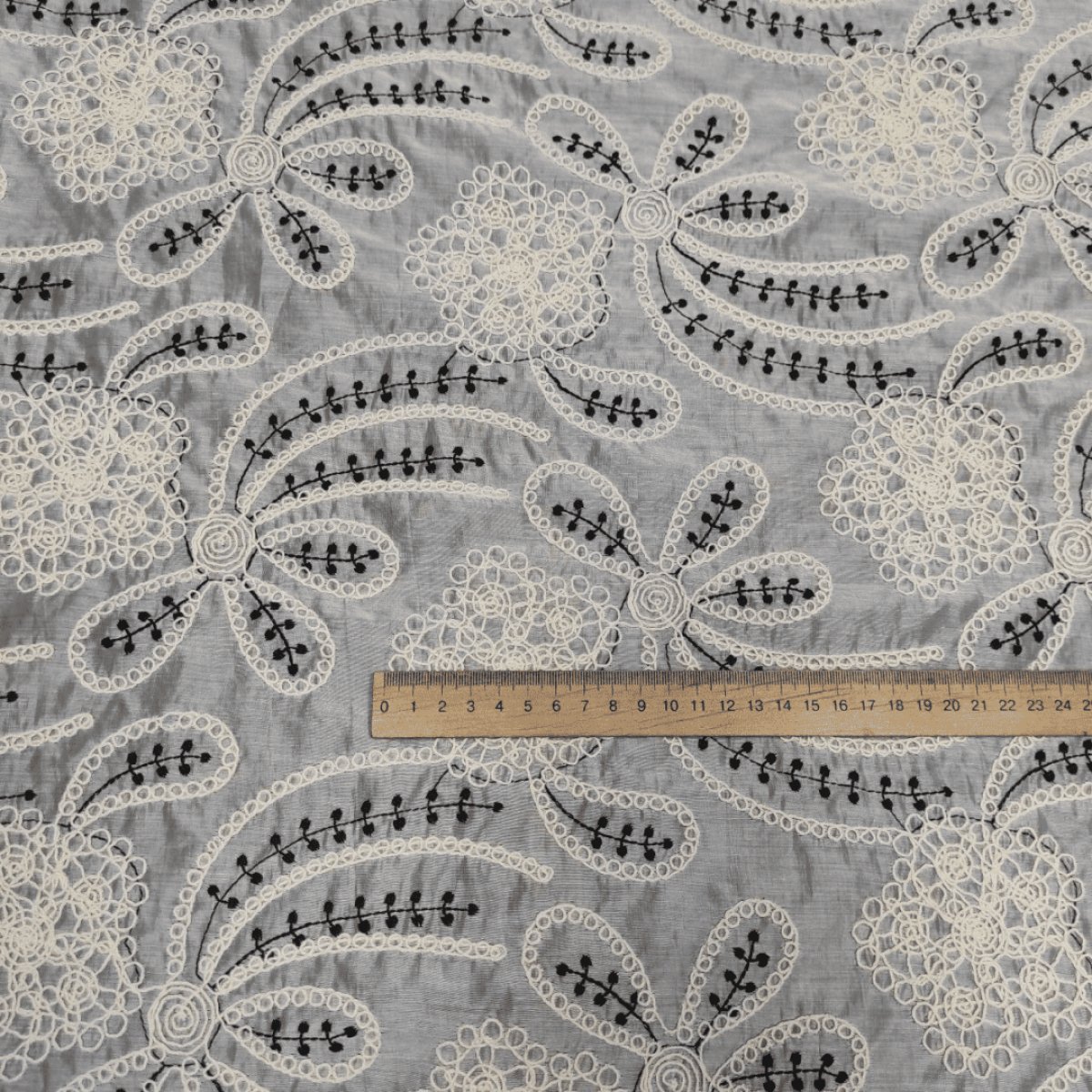 Напівпрозора структура і перлинний блиск успадковані від класичної органзи, створюючи елегантний і благородний зовнішній вигляд. Тканина прикрашена оригінальною вишивкою із щільної нитки, нашитої по лицьовому боці, що надає їй фактури та додаткової щільності.
