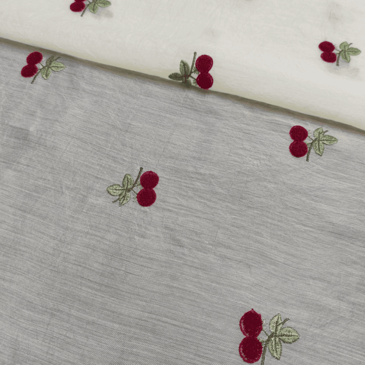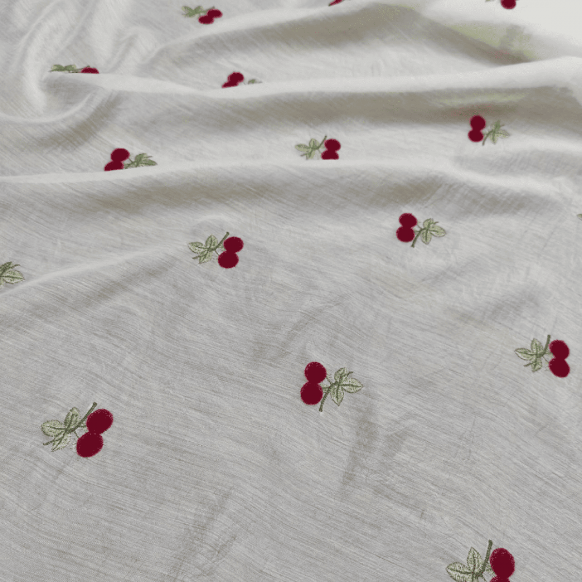 Органза віскозна з вишивкою "CHERRY" – вишукана тканина з фактурною махровою вишивкою червоною ниткою у вигляді вишень на вершковій прозорій основі з легким благородним блиском. Діаметр вишеньки – 2 см. Тканина легка, але міцна, плавно драпірується і добре спадає, майже не помається, зручна у носінні.