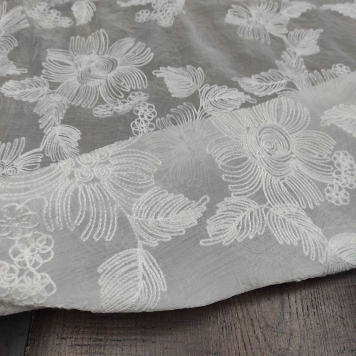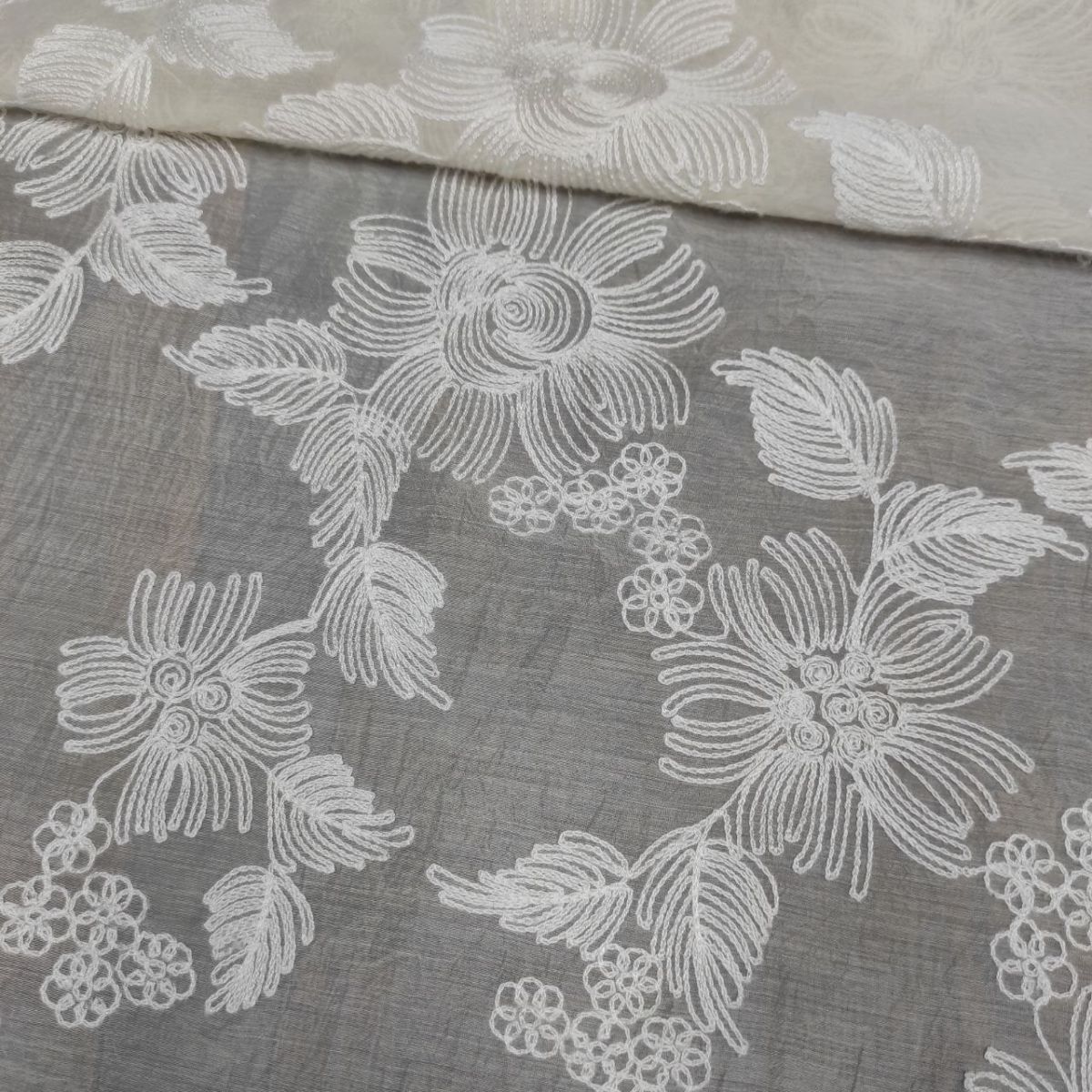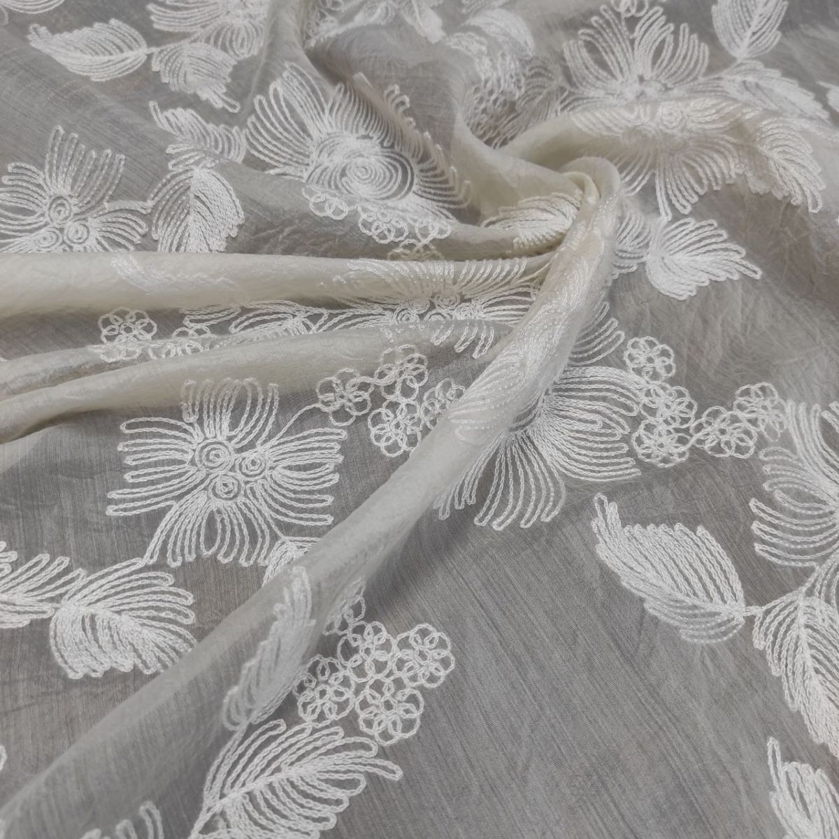 Органза віскозна з вишивкою "Ester" – вишукана тканина з фактурною матовою вишивкою молочною віскозною ниткою у вигляді великих квіткових мотивів на вершковій прозорій основі з легким благородним блиском.