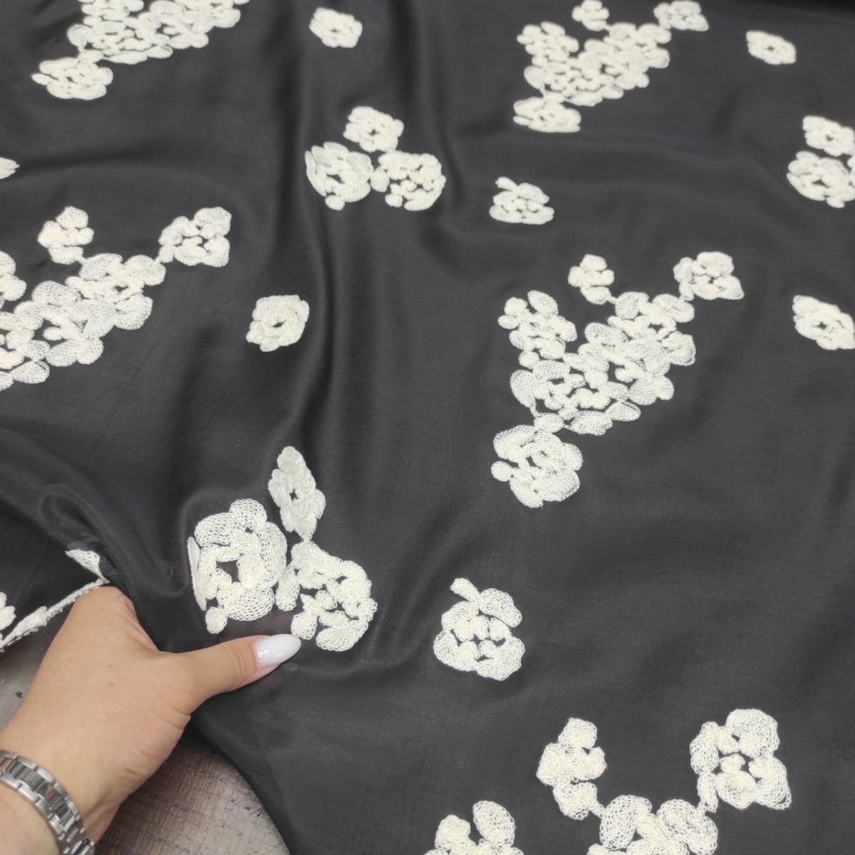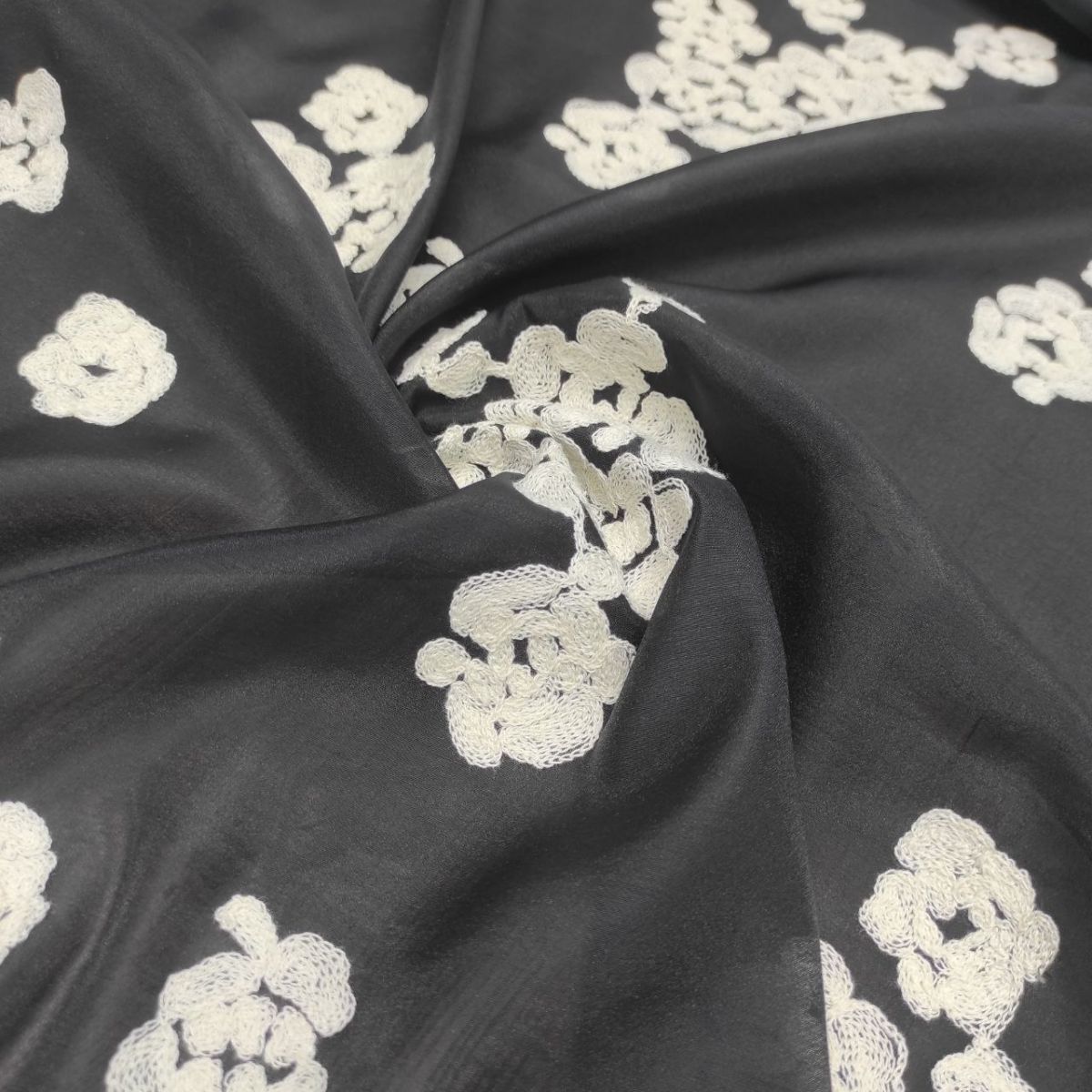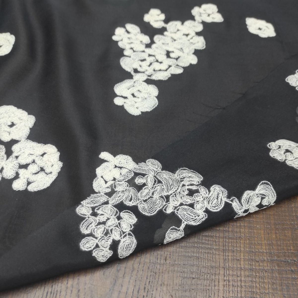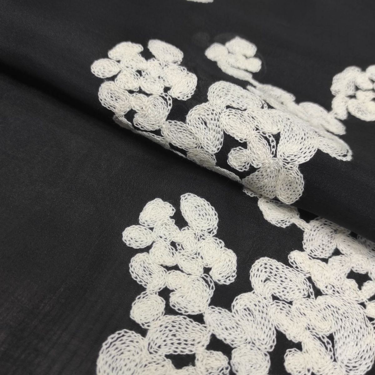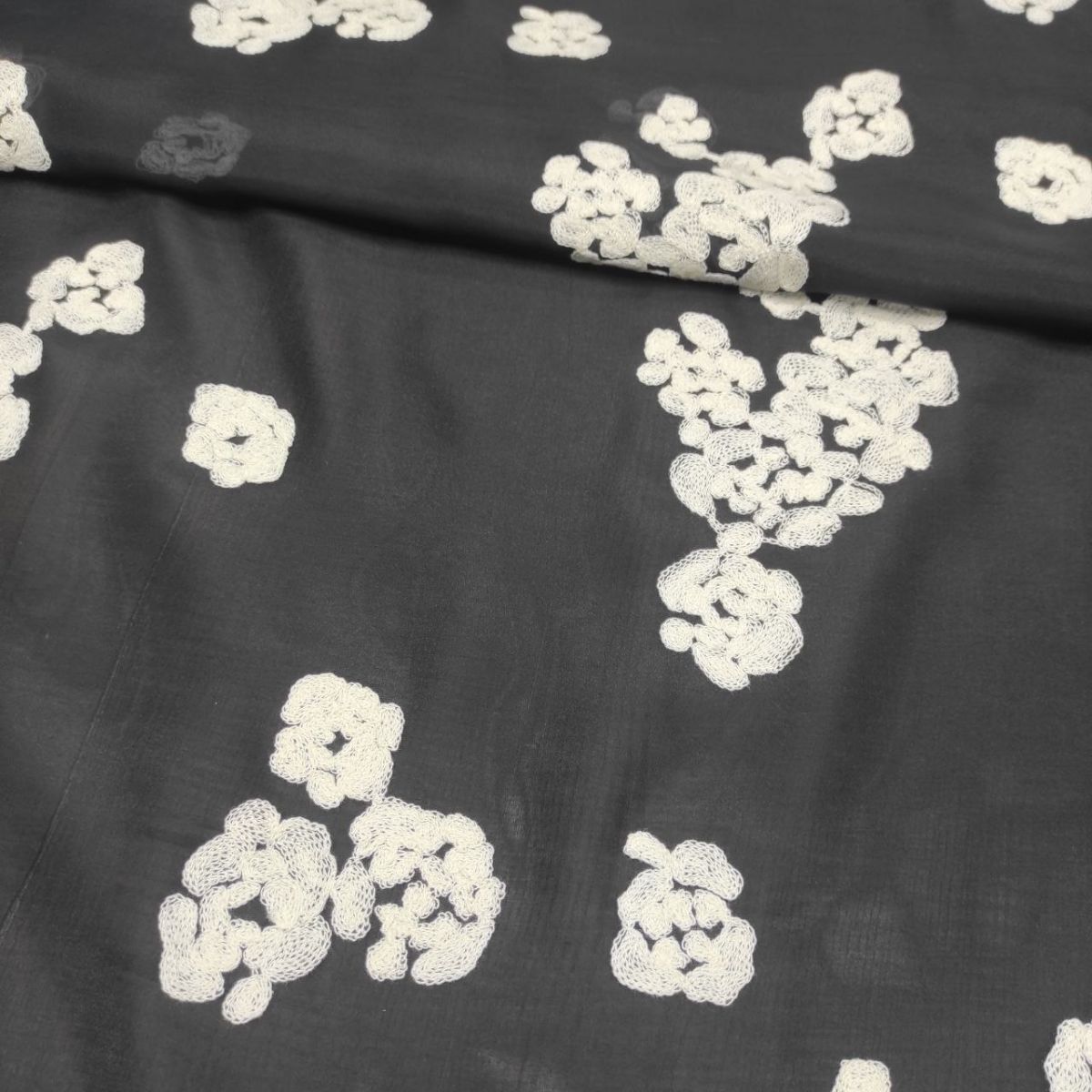 Органза віскозна з вишивкою "Milena" – вишукана тканина з фактурною матовою вишивкою молочною віскозною ниткою у вигляді абстрактних квіткових мотивів на чорній прозорій основі з легким благородним блиском.