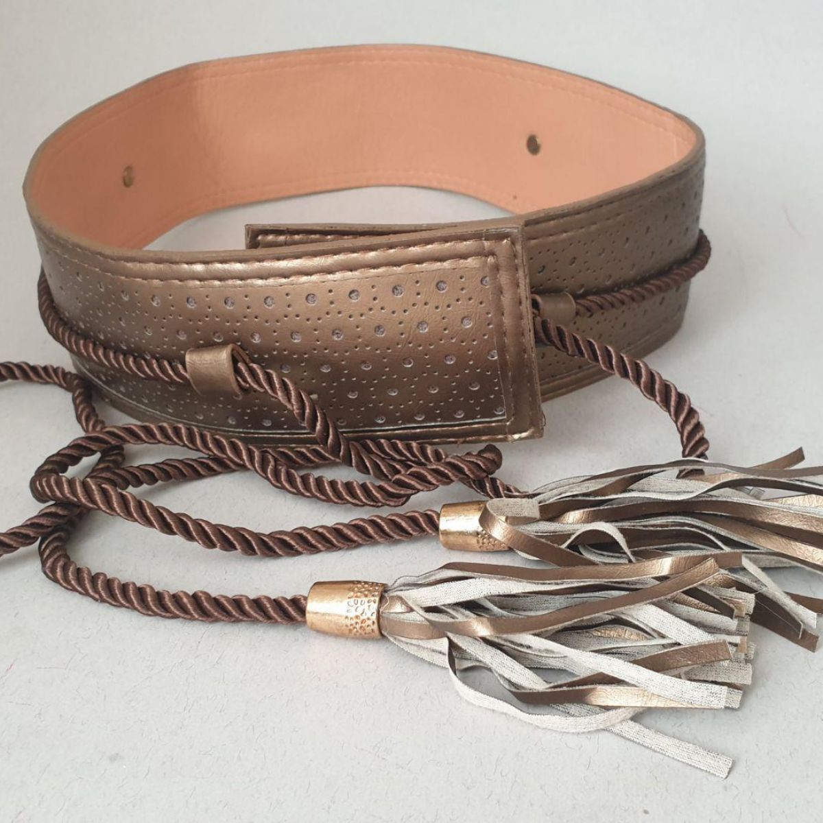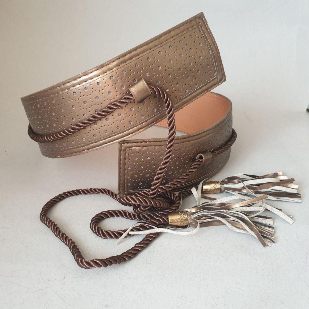 Пояс широкий, бронзовий із шовковистим шнуром із бронзовими китицями.
