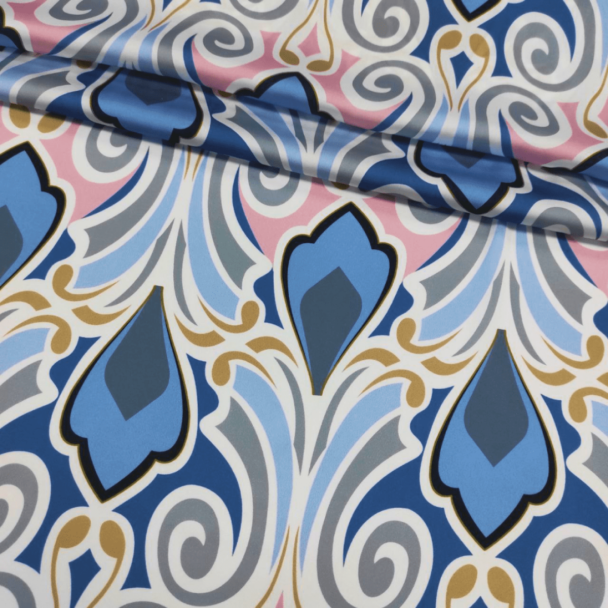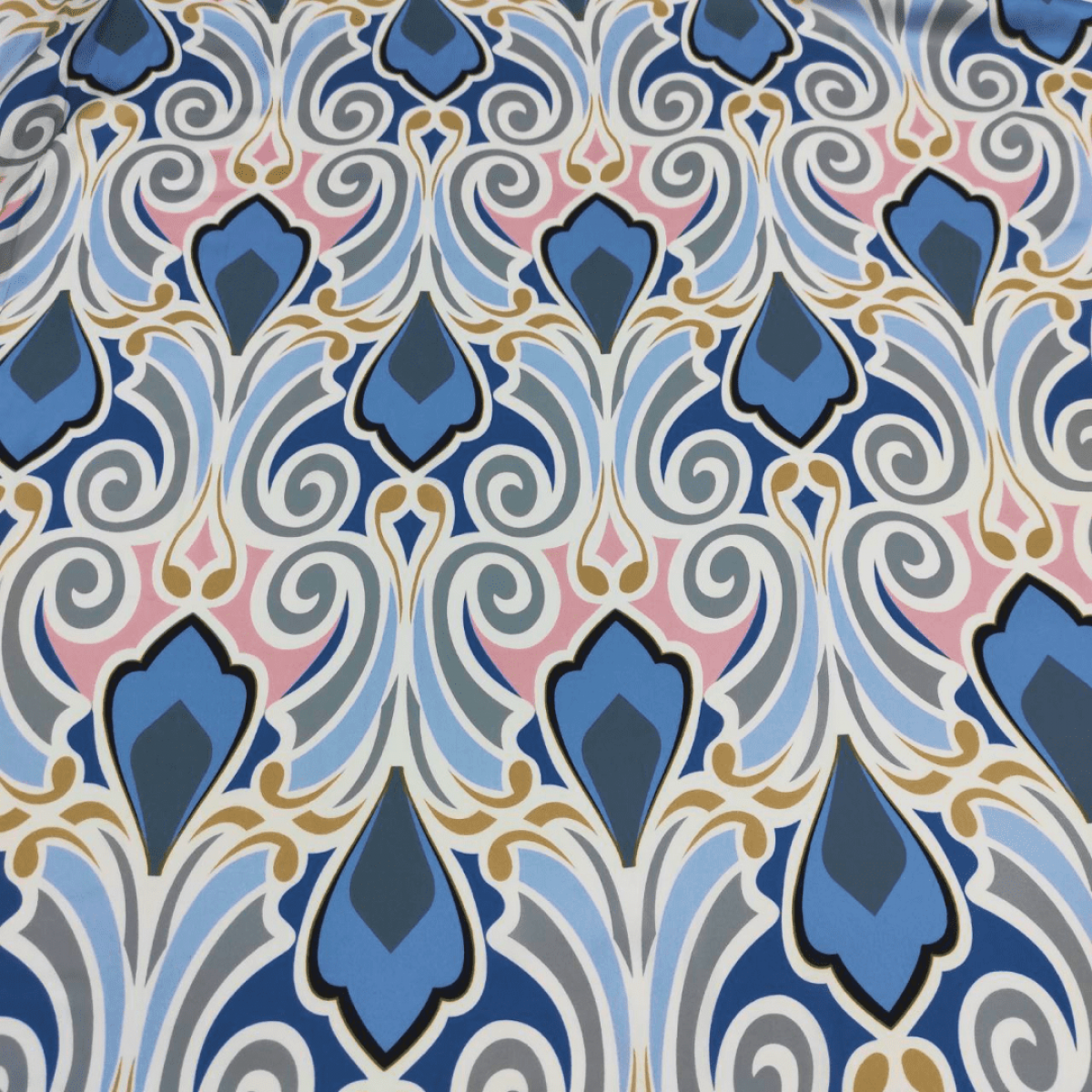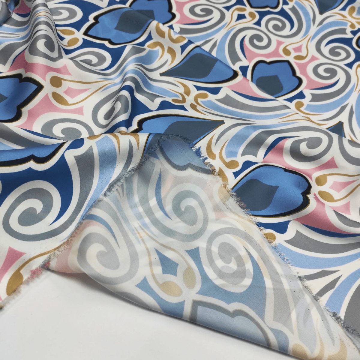 Малюнок у вигляді фантазійного орнаменту в блакитному, красивого джинсового відтінку, рожевому, сірому, синьому та бронзовому кольорах на молочному тлі.