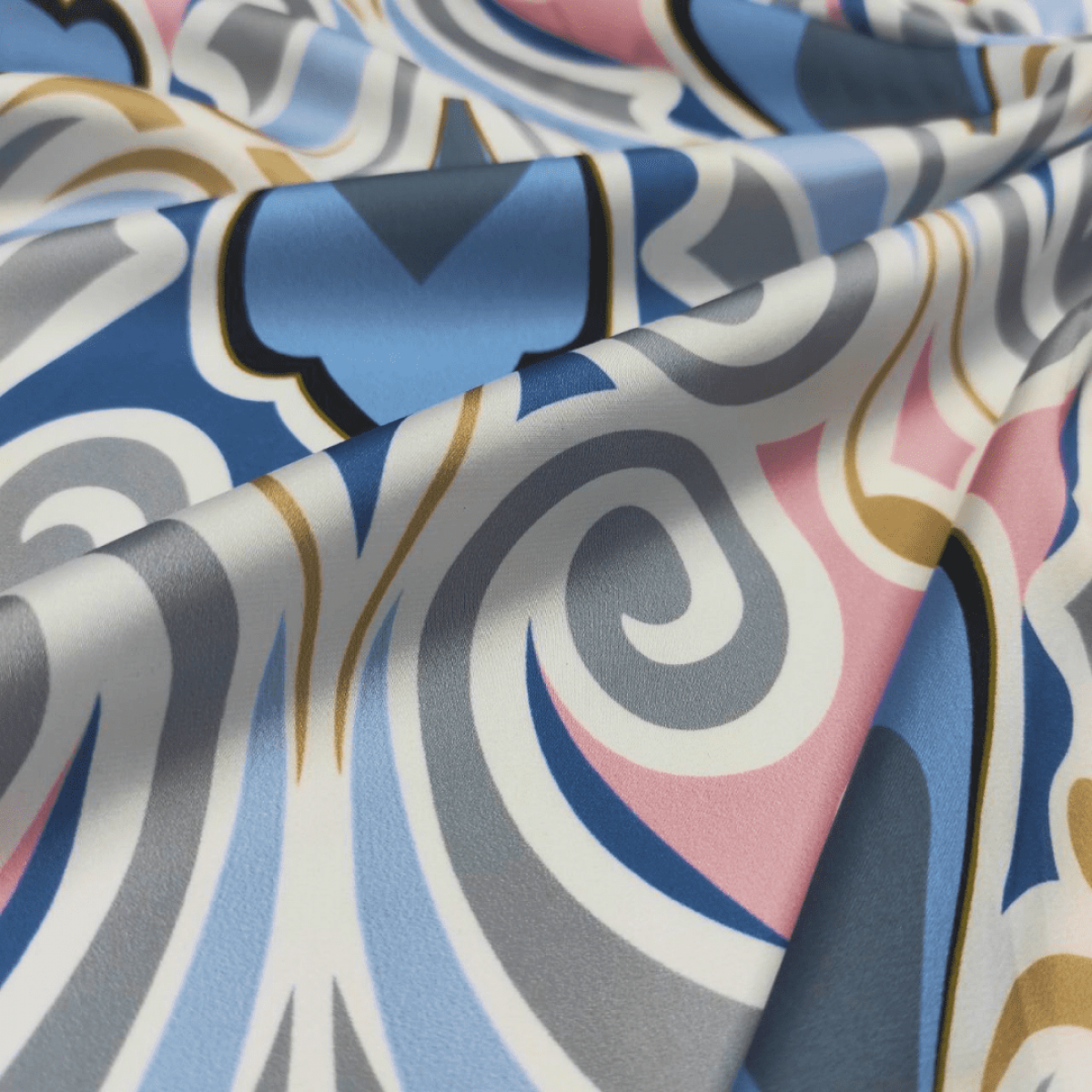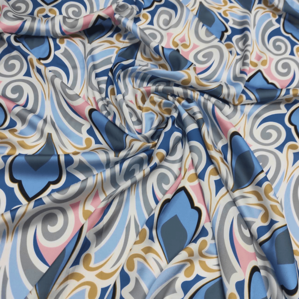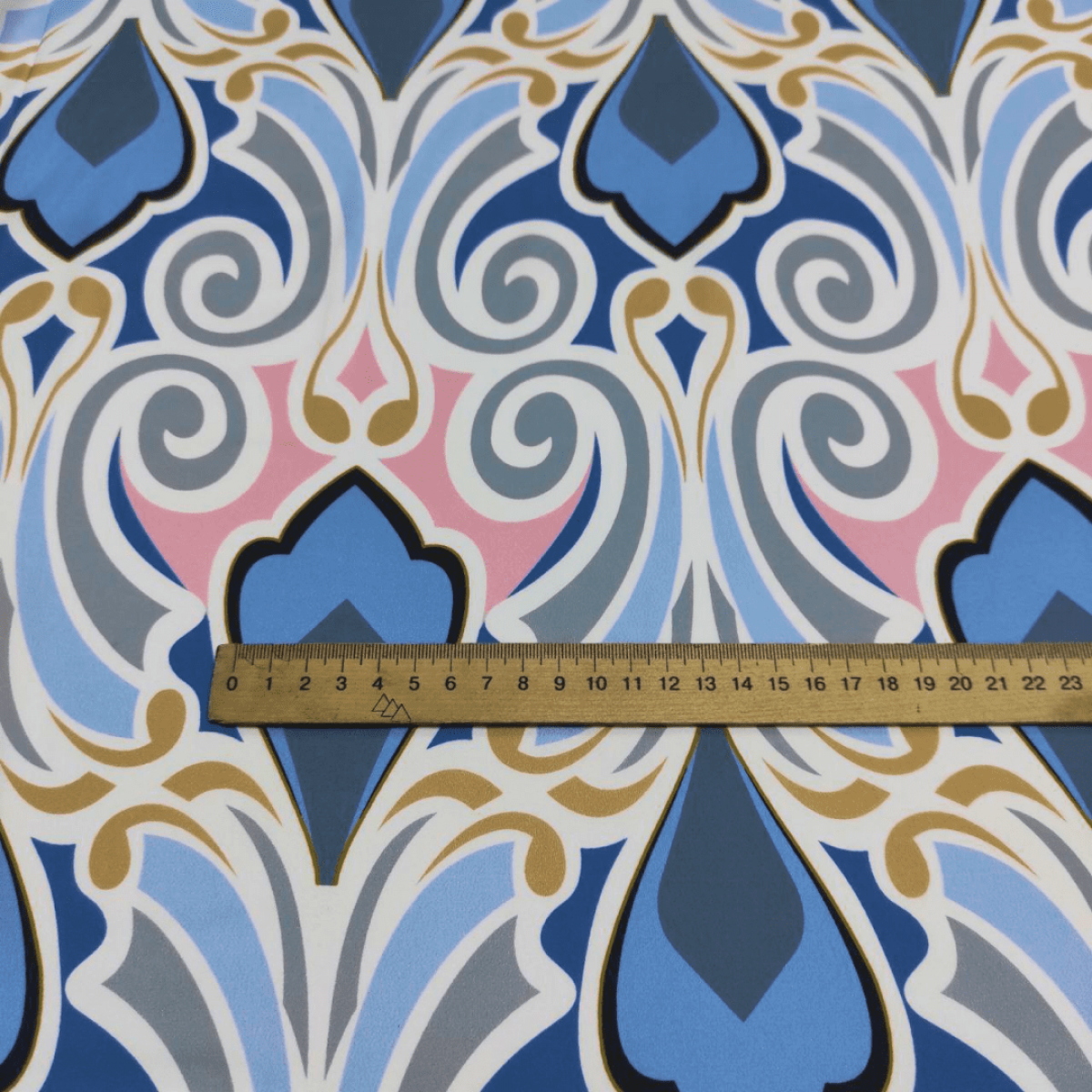 Малюнок у вигляді фантазійного орнаменту в блакитному, красивого джинсового відтінку, рожевому, сірому, синьому та бронзовому кольорах на молочному тлі.