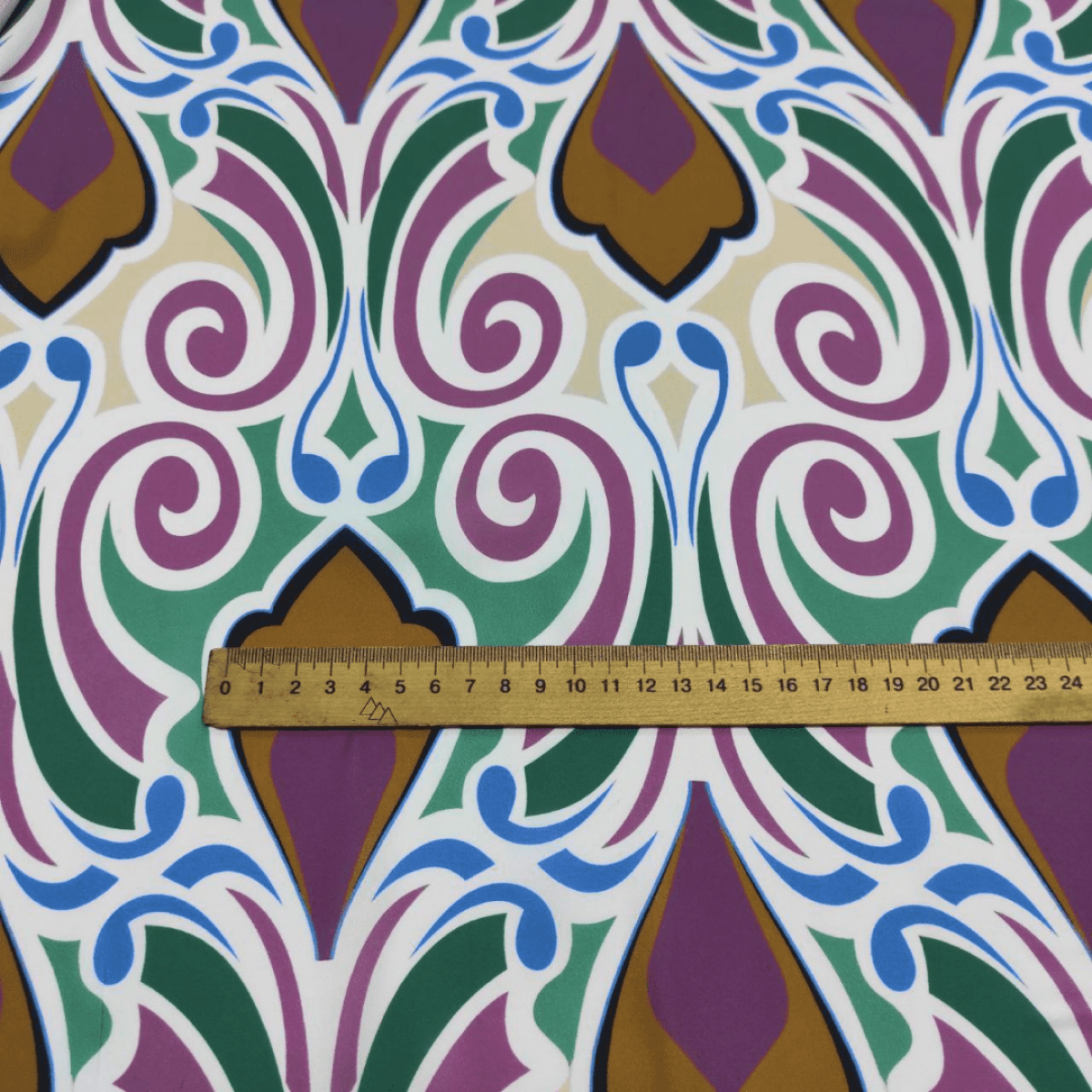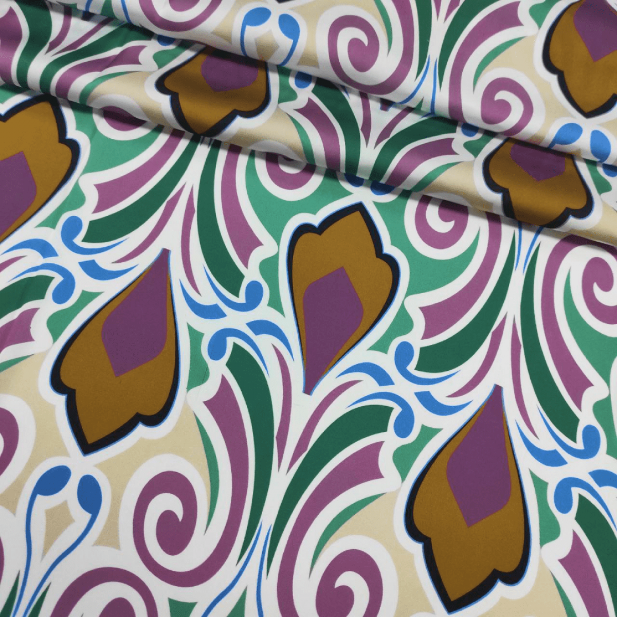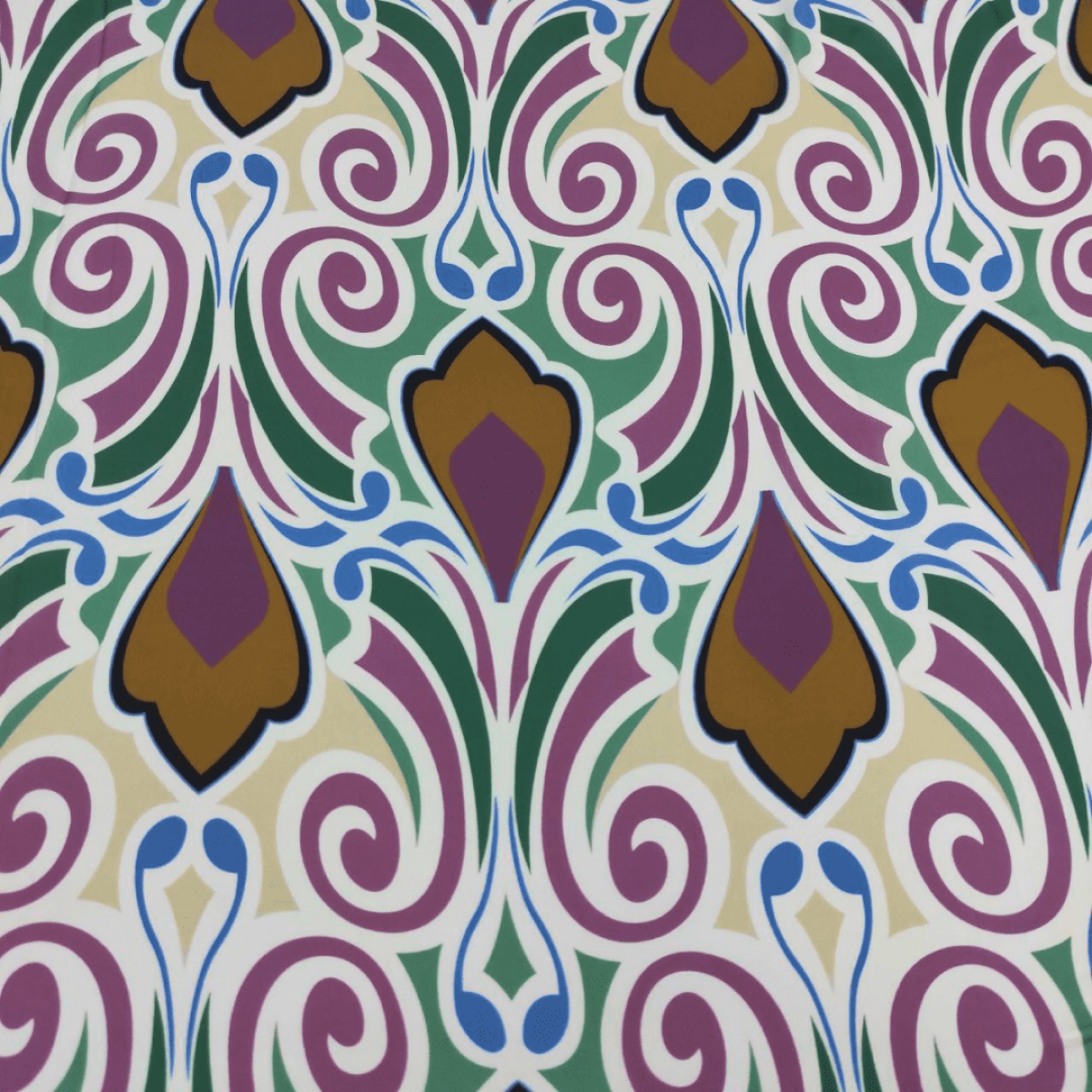 Малюнок у вигляді фантазійного орнаменту в коричневому, відтінку темної бронзи, темний тауп, синій, в зелених і бежевих кольорах на молочному тлі.
