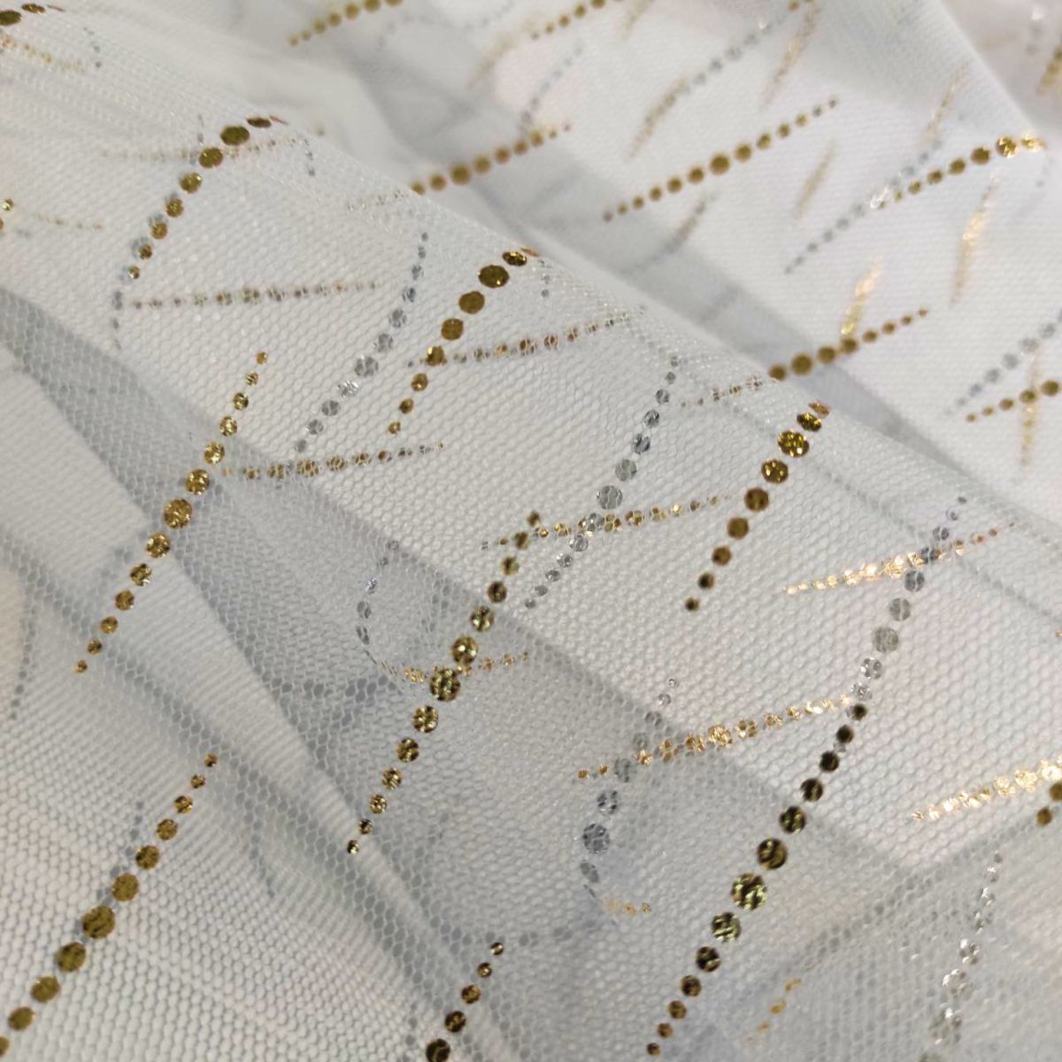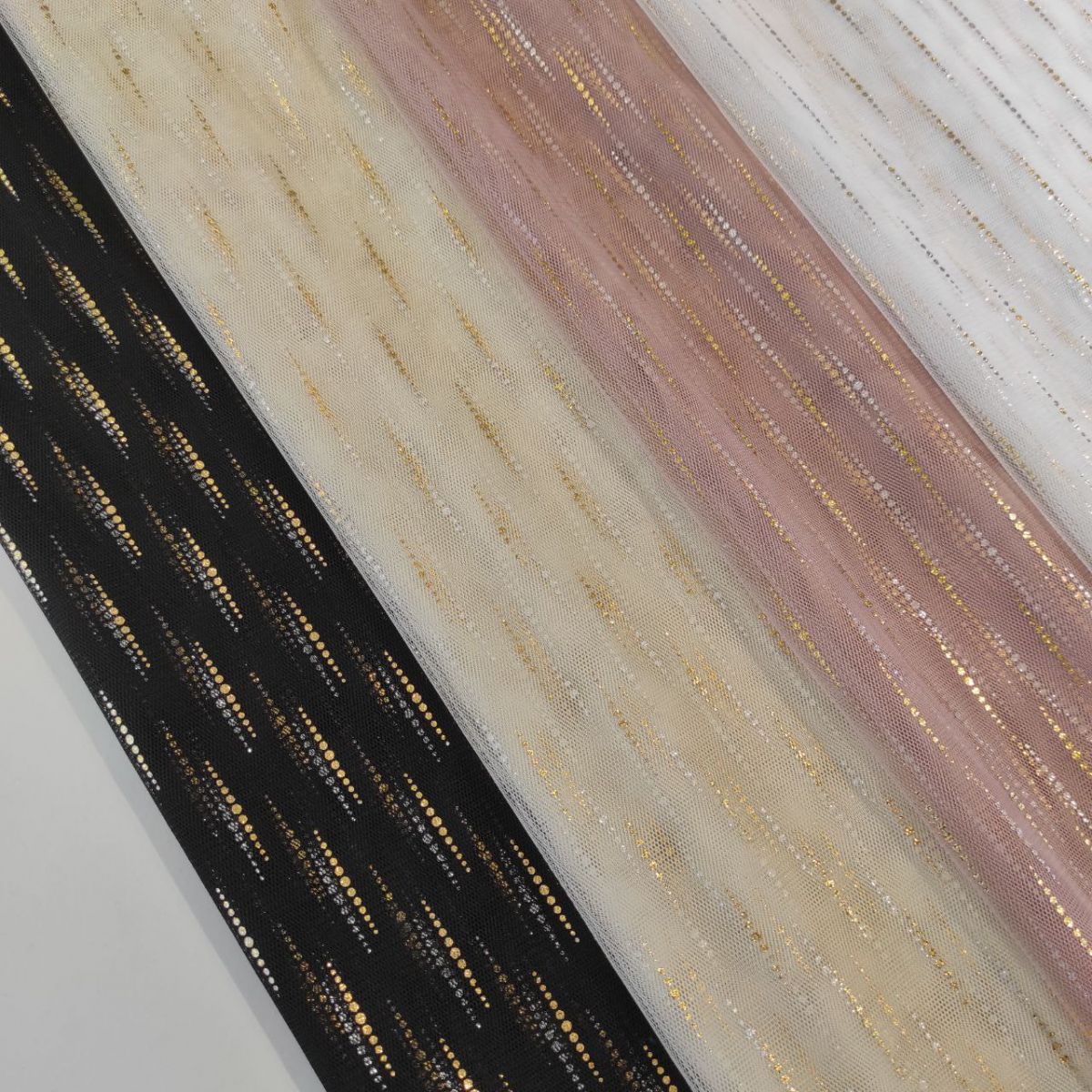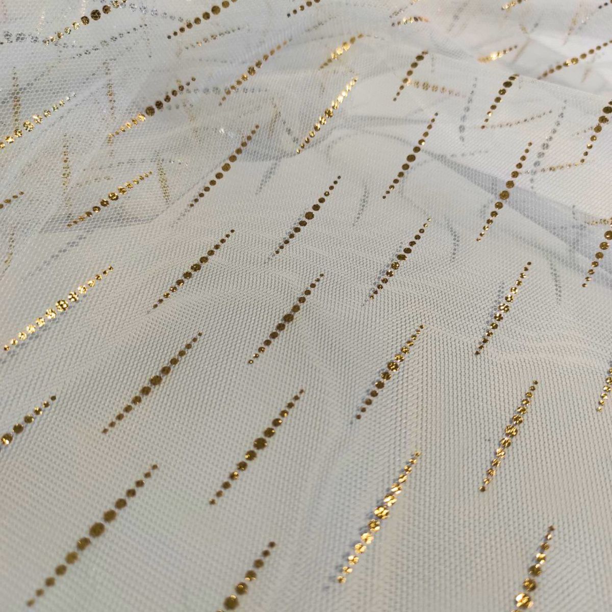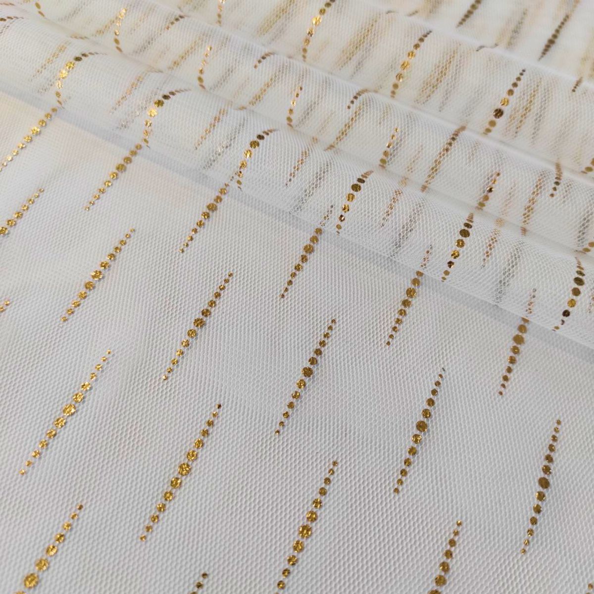 Сітка "Luvia" - зіткане з дрібних осередків полотно з напиленням у вигляді ніжних рисочок з крапок, що нагадують дощинки, золотих з лицьового боку і срібних з виворітного. Своєю структурою сітка нагадує традиційний фатин. Однак, за складом та тактильними відчуттями вони абсолютно різні. Тонка, міцна і напівпрозора тканина трикотажного типу чудово пропускає повітря, не дратує шкіру і часто використовується при створенні: білизни, суконь, спідниць, весільного вбрання, концертних костюмів. Малюнок із золотим дощиком додає витонченості будь-якому виробу.