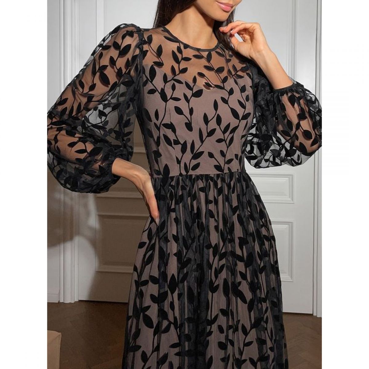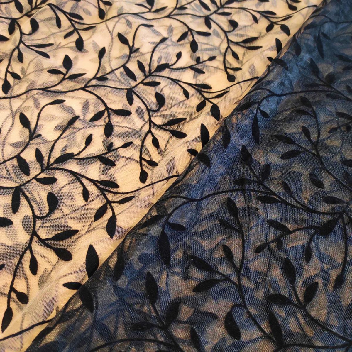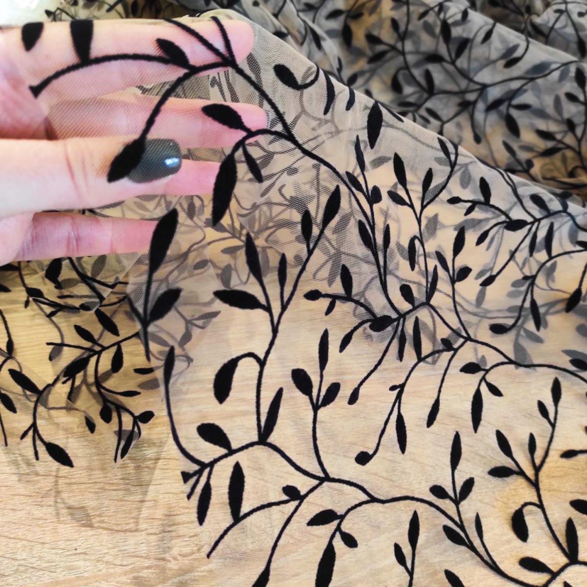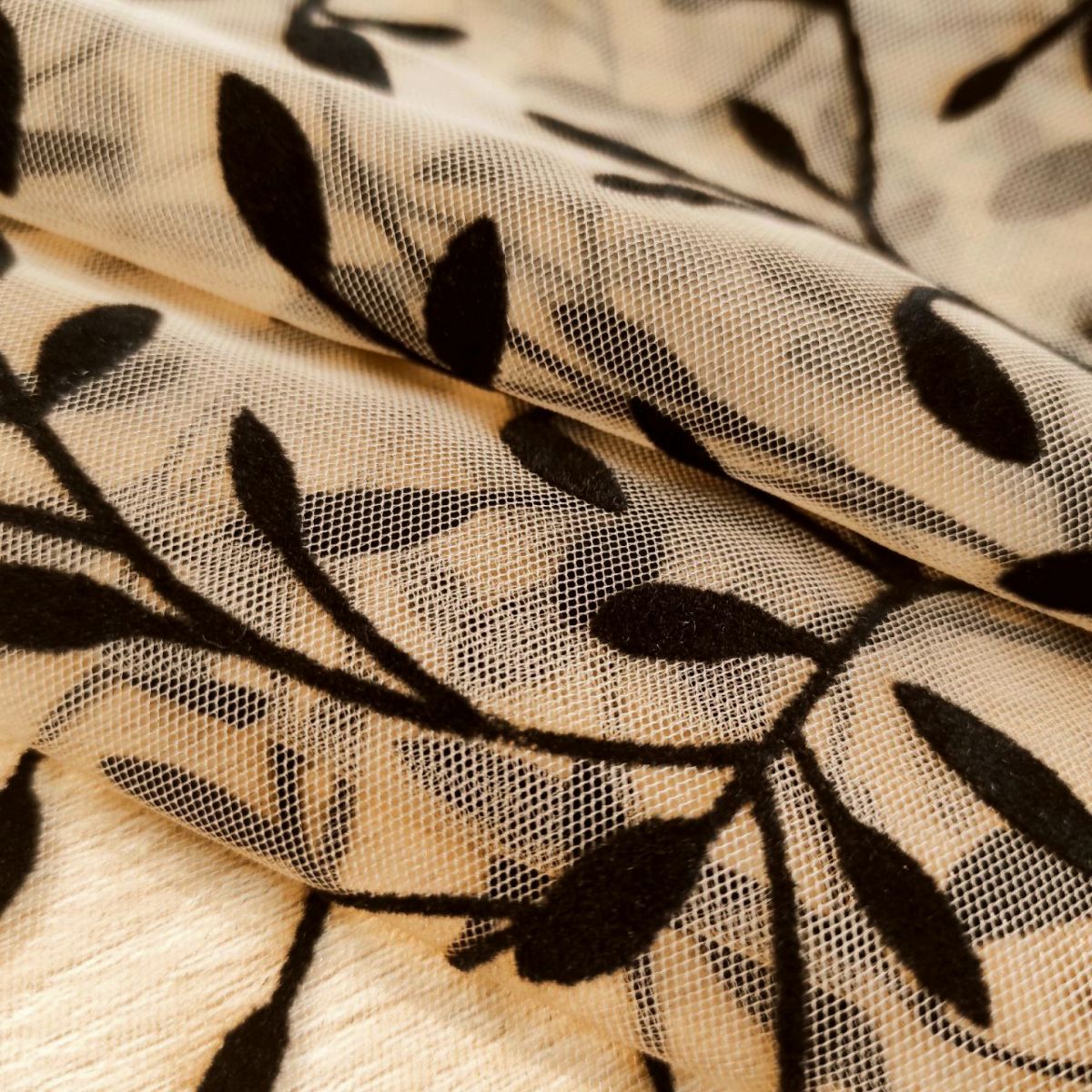 В міру м'яка сітка з флоковим напиленням у вигляді чорних гілочок на бежевій сітці, добре тримає форму. Тканина підходить для пошиття пишних спідниць, суконь, блуз з об'ємними рукавами.