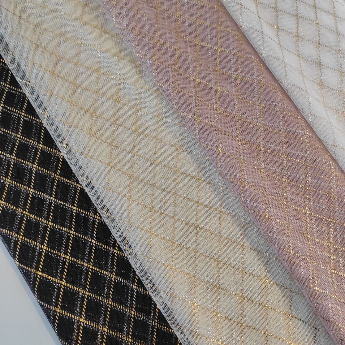 Своєю структурою сітка нагадує традиційний фатин. Однак, за складом та тактильними відчуттями вони абсолютно різні. Тонка, міцна і напівпрозора тканина трикотажного типу чудово пропускає повітря, не дратує шкіру і часто використовується при створенні: білизни, суконь, спідниць, весільного вбрання, концертних костюмів. Малюнок із золотими ромбами додає витонченості будь-якому виробу.