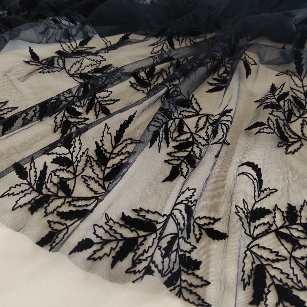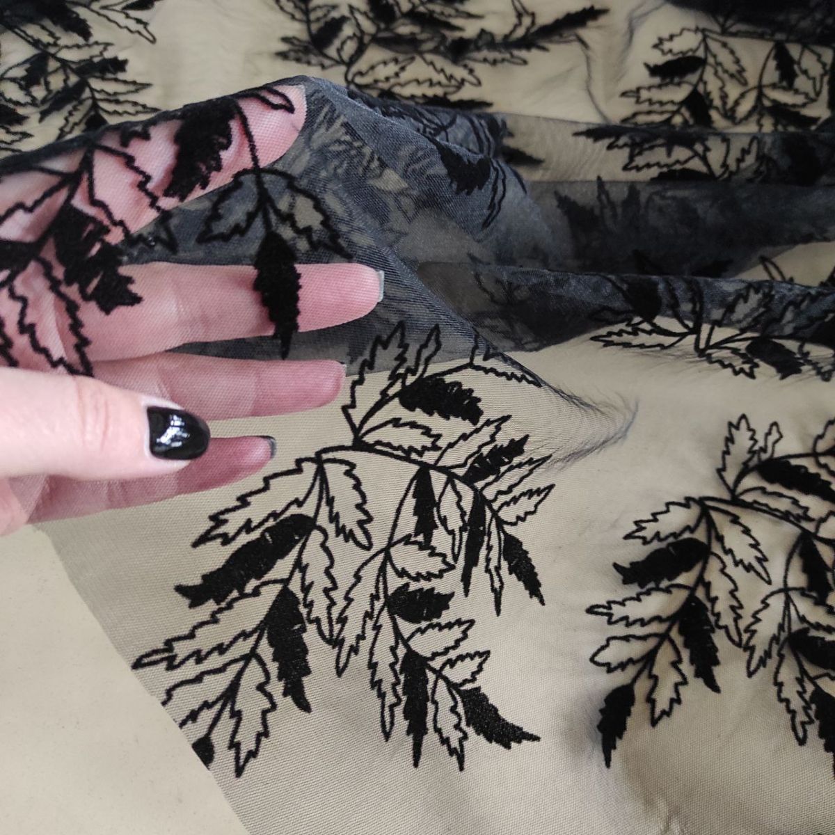В міру м'яка сітка з флоковим напиленням у вигляді чорних гілочок з листочками на бежевому тлі, добре тримає форму. Тканина підходить для пошиття пишних спідниць, суконь, блуз з об'ємними рукавами.
