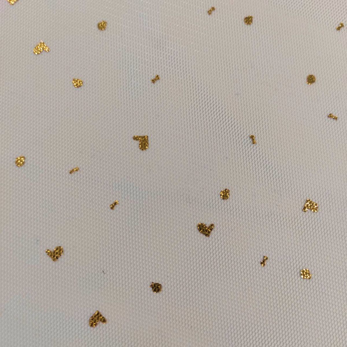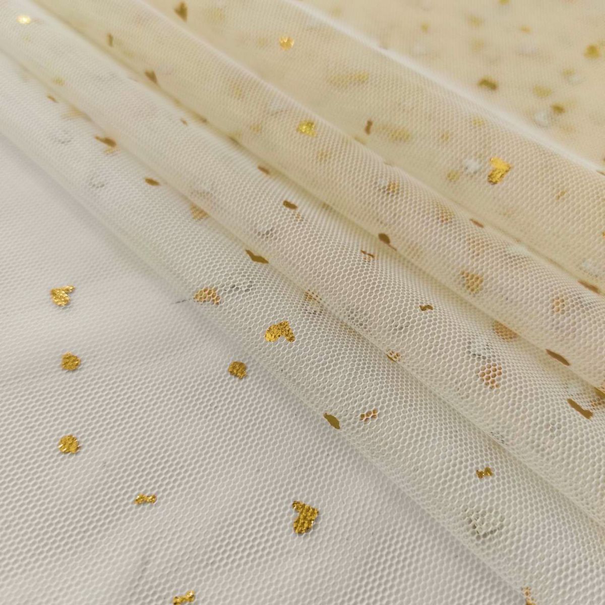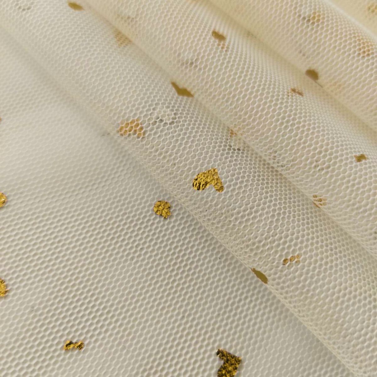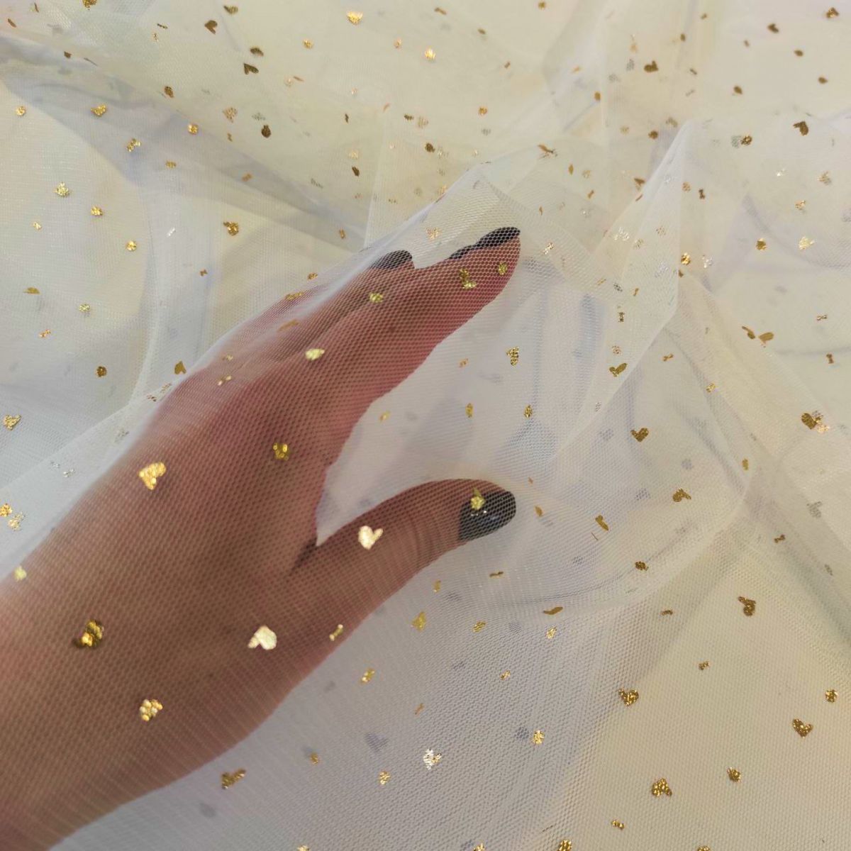Сітка "Tocco" - зіткане з дрібних осередків полотно з напиленням у вигляді ніжних золотих сердечок з лицьового боку і срібних з виворітної, яке своєю структурою нагадує традиційний фатин. Однак, за складом та тактильними відчуттями вони абсолютно різні. Тонка, міцна і напівпрозора тканина трикотажного типу чудово пропускає повітря, не дратує шкіру і часто використовується при створенні: білизни, суконь, спідниць, весільного вбрання, концертних костюмів. Малюнок із дрібними золотими серцями додає витонченості будь-якому виробу.