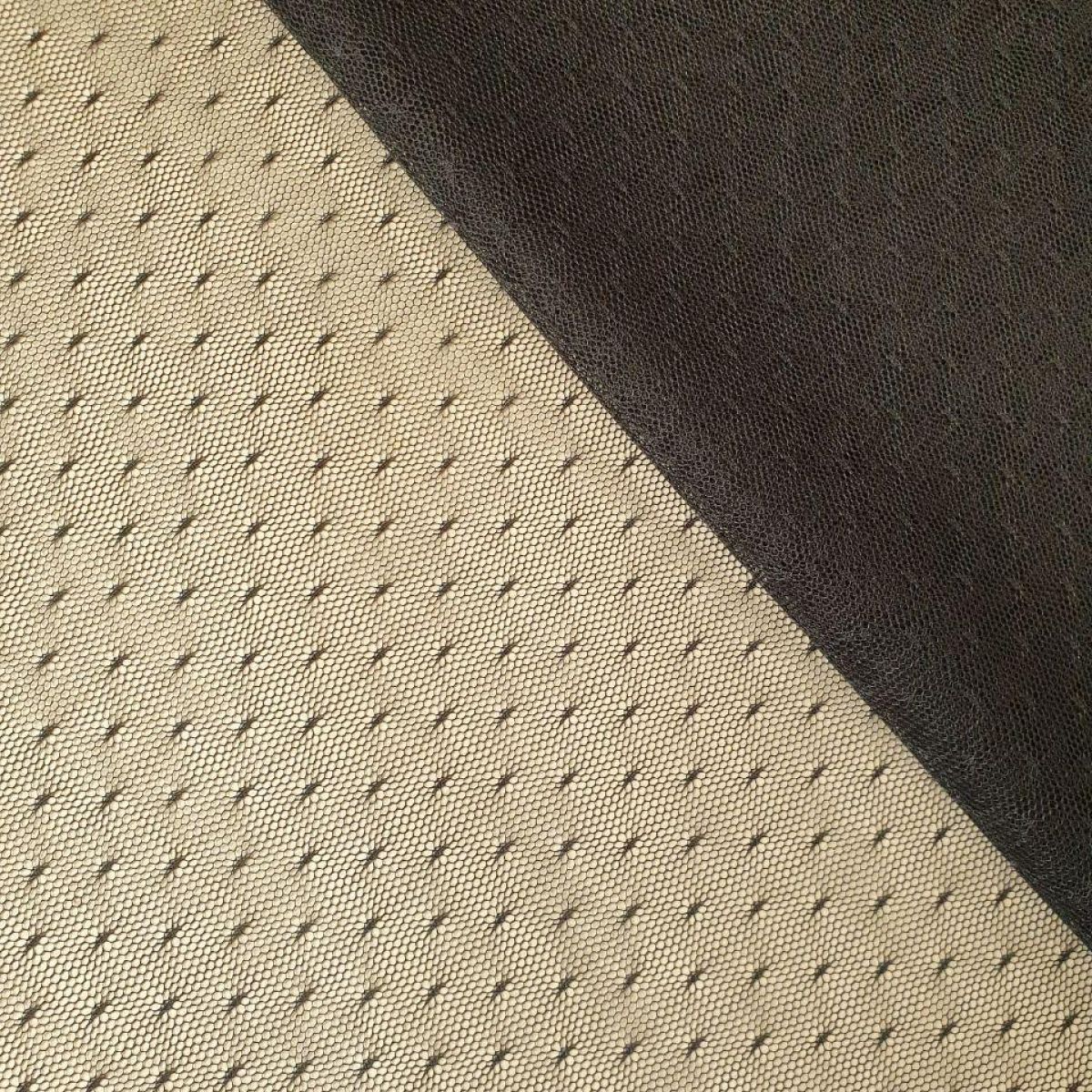 Сітка "Точка" - м'яке і еластичне полотно, виткане з дрібних чарунків, яке своєю структурою нагадує традиційний фатин. Однак, за складом і тактильним відчуттям вони абсолютно різні. Тонка, міцна і напівпрозора тканина трикотажного типу прекрасно пропускає повітря, не подразнює шкіру і часто використовується при створенні: натільної білизни, суконь, спідниць, весільних нарядів, концертних костюмів. Малюнок в дрібну точку додає витонченості будь-якому виробу.