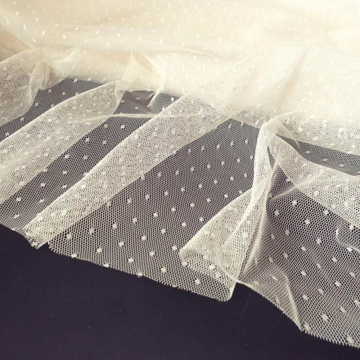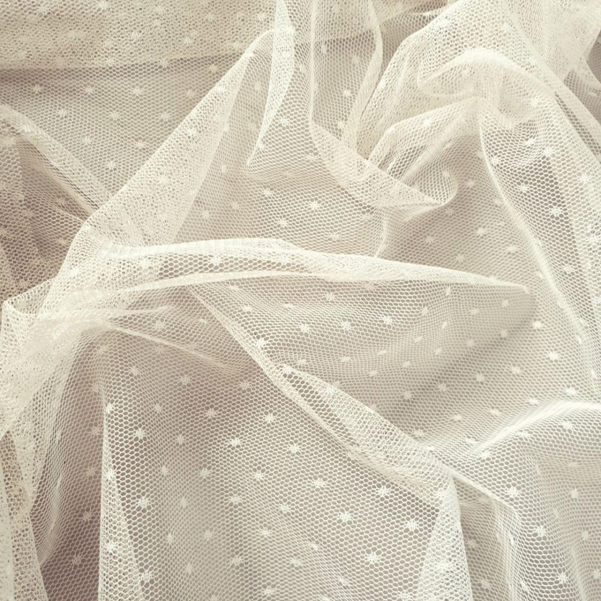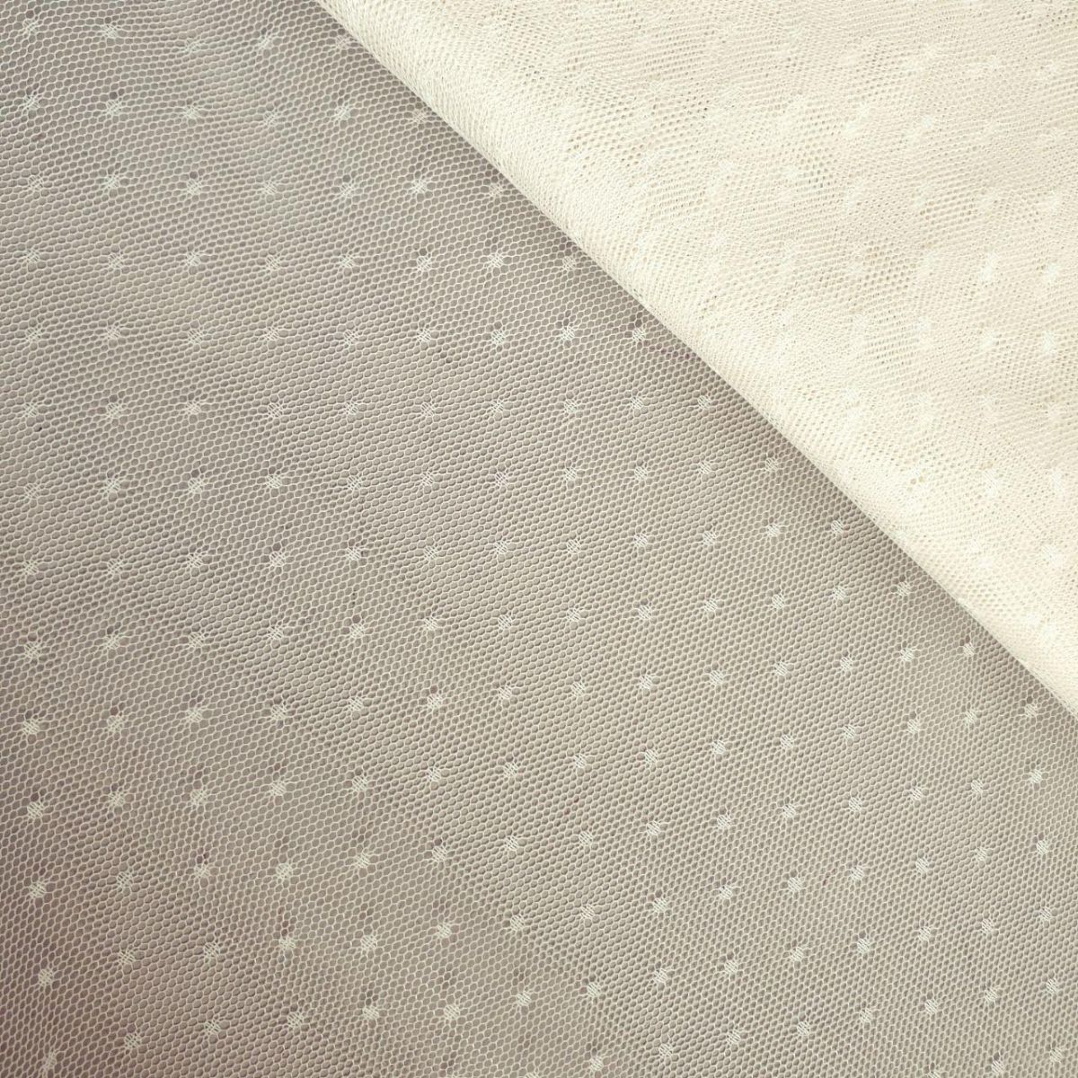 Сітка "Точка" - м'яке і еластичне полотно, виткане з дрібних чарунків, яке своєю структурою нагадує традиційний фатин. Однак, за складом і тактильним відчуттям вони абсолютно різні. Тонка, міцна і напівпрозора тканина трикотажного типу прекрасно пропускає повітря, не подразнює шкіру і часто використовується при створенні: натільної білизни, суконь, спідниць, весільних нарядів, концертних костюмів. Малюнок в дрібну точку додає витонченості будь-якому виробу.