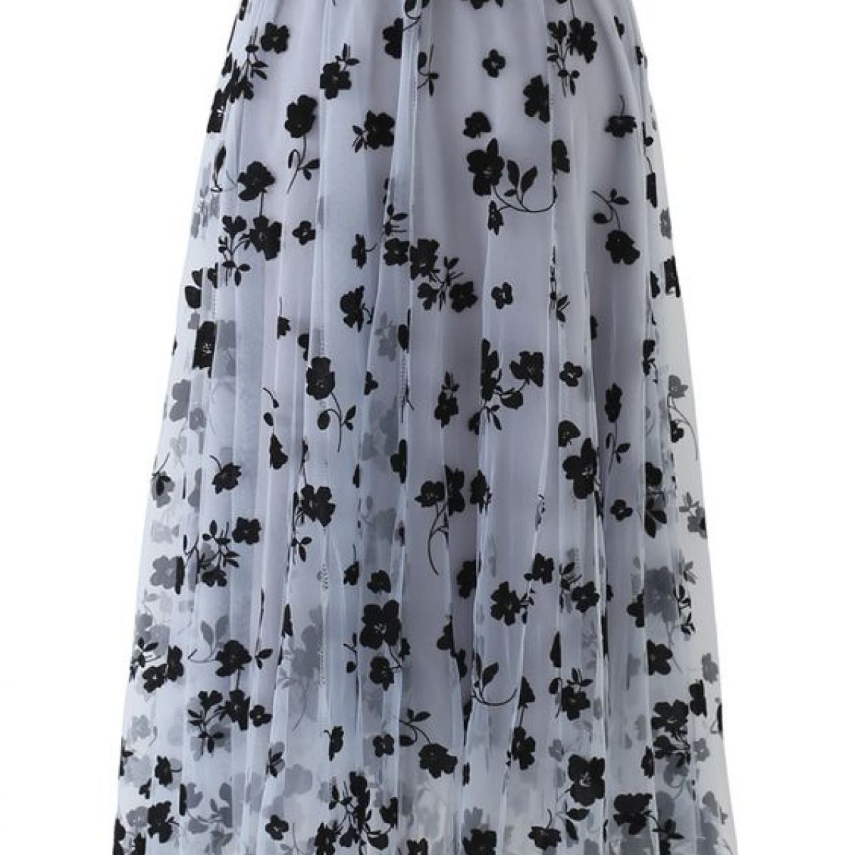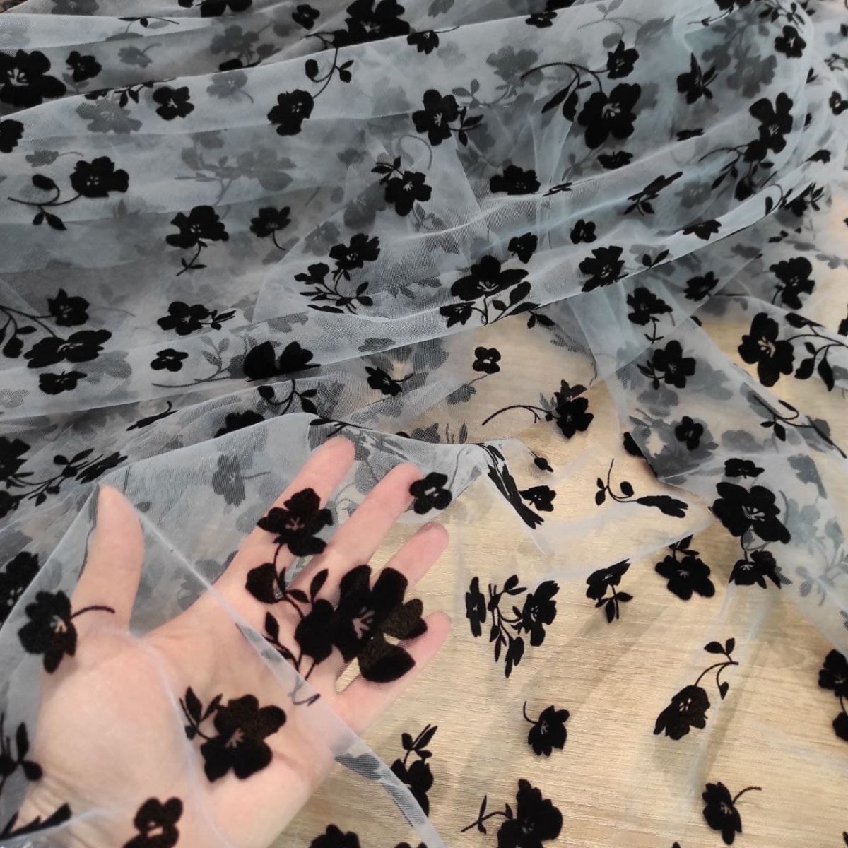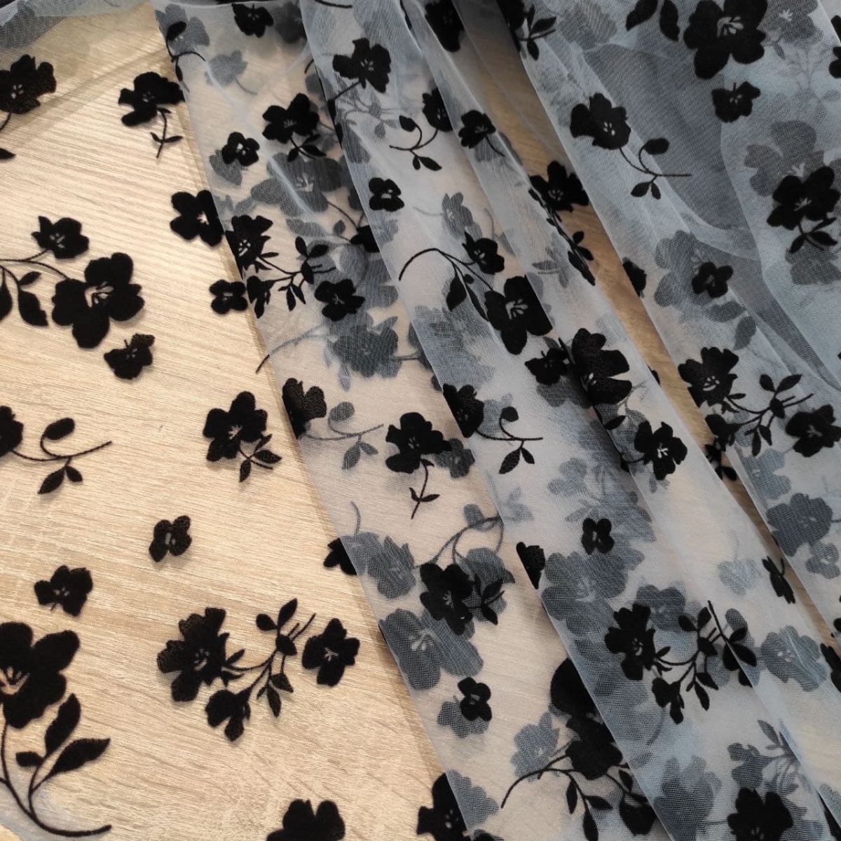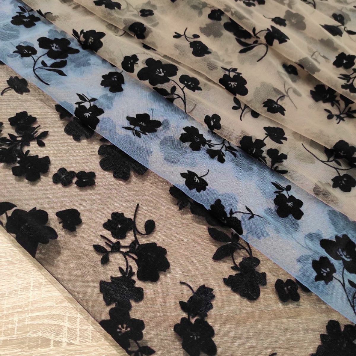 В міру м'яка сітка з флоковим напиленням у вигляді квітів, добре тримає форму. Тканина підходить для пошиття пишних спідниць, суконь, блуз з об'ємними рукавами.