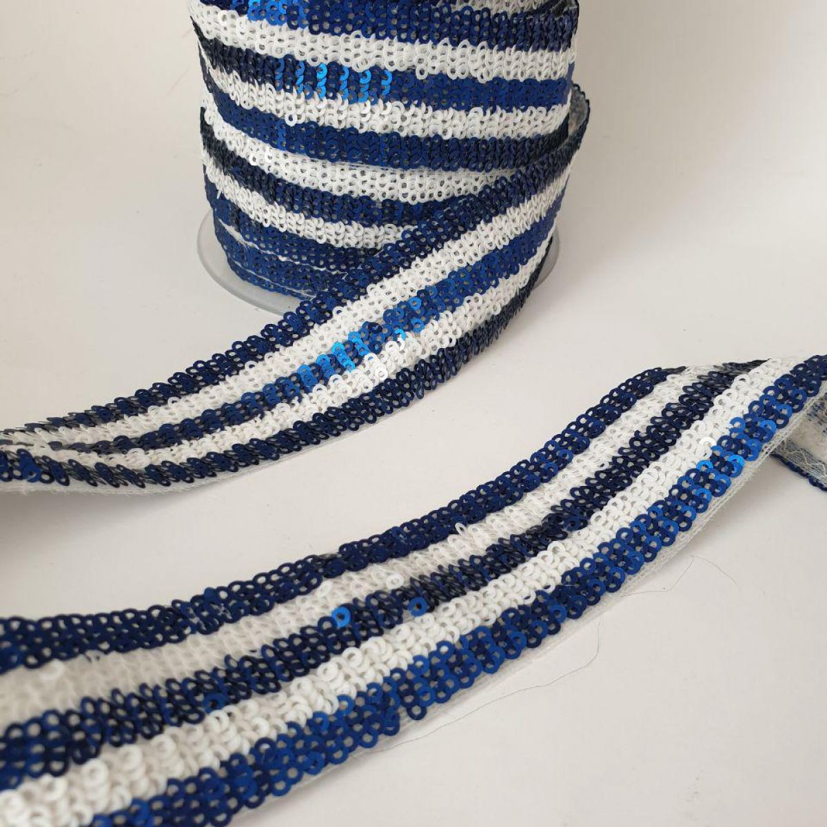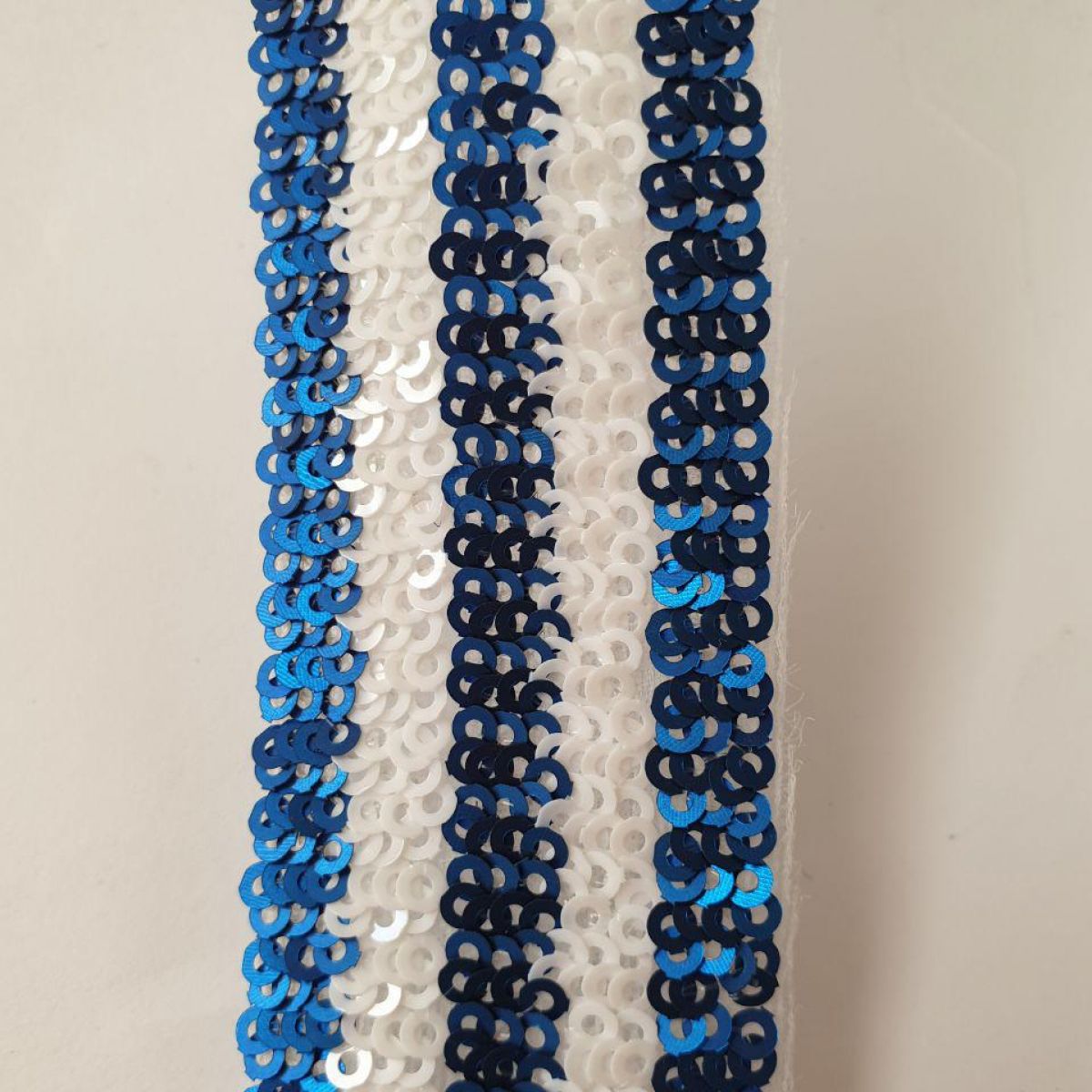 Тасьма з лелітками – смужки синіх і білих дрібних паєток на основі з подвійної капронової сітки, не тягнеться.